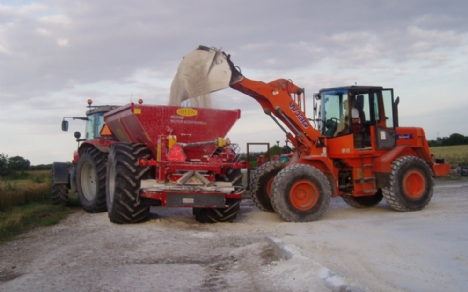 Vi tilbyder kalkspredning med 2 stk Bredal spredere. Vi kører med kalk fra mark og eget lager