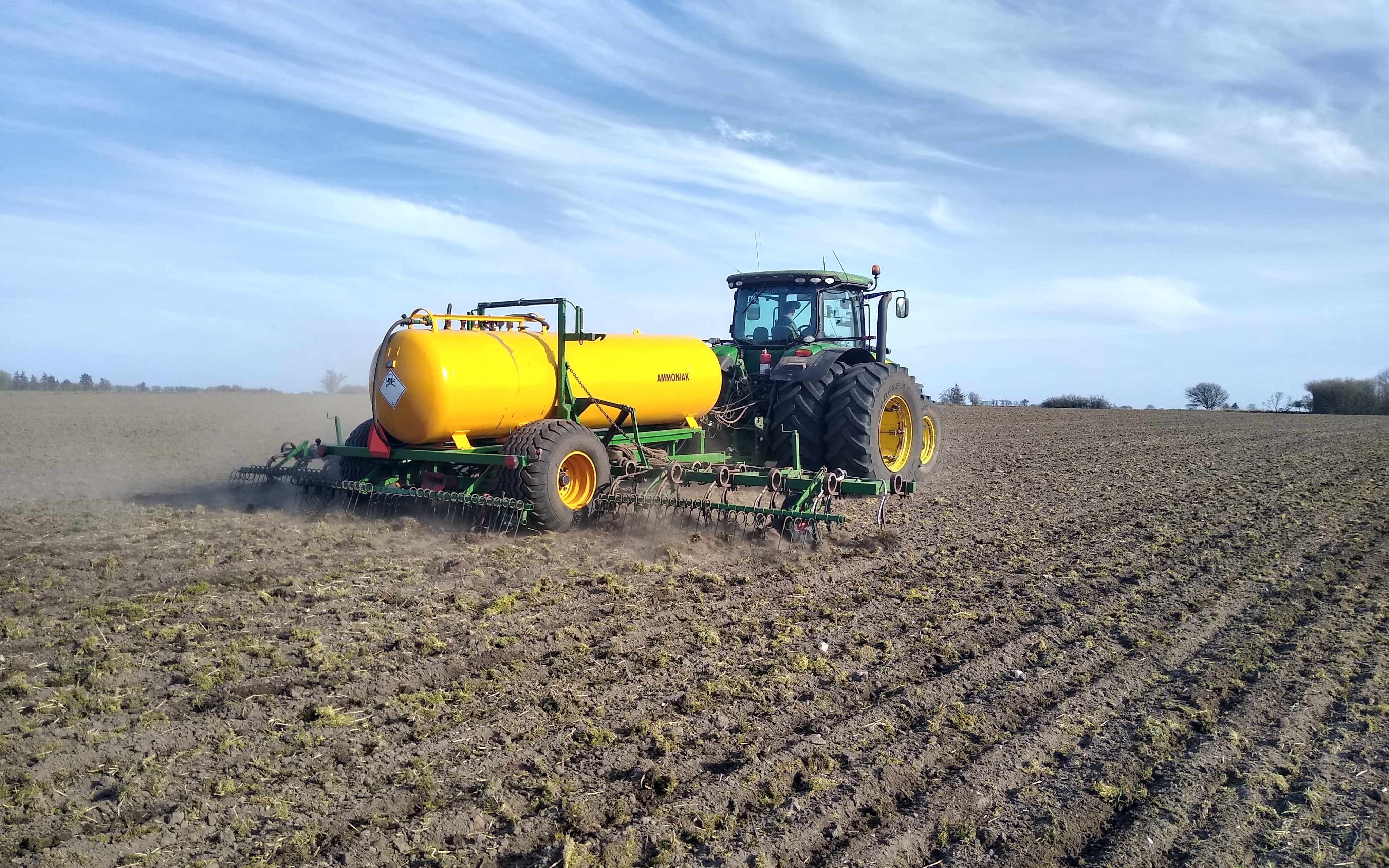 Nedfældning af ammoniak tilbydes. 9.3m arbejdsbredde. Sporløsning bag hjul på nedfælderen. Altid ammoniak på lager. Frigivelse af N over hele vækstperioden. Er der meget regn? Ingen udvaskning. Er der tørke? Stadig tilgængelig - Ingen granulat der skal opløses. Billigste form for kvælstof på markedet. Jejsing Maskinstation ApS - Al landbrugsarbejde udføres