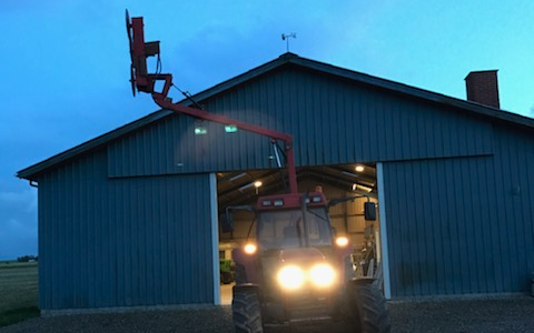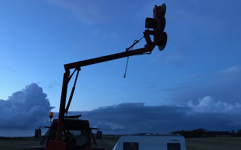 Vedligehold af læhegn med 7m traktor monteret klipper. Maskine klipper med store rundsavsklinger og kan nemt tage grene op til 15cm diameter
