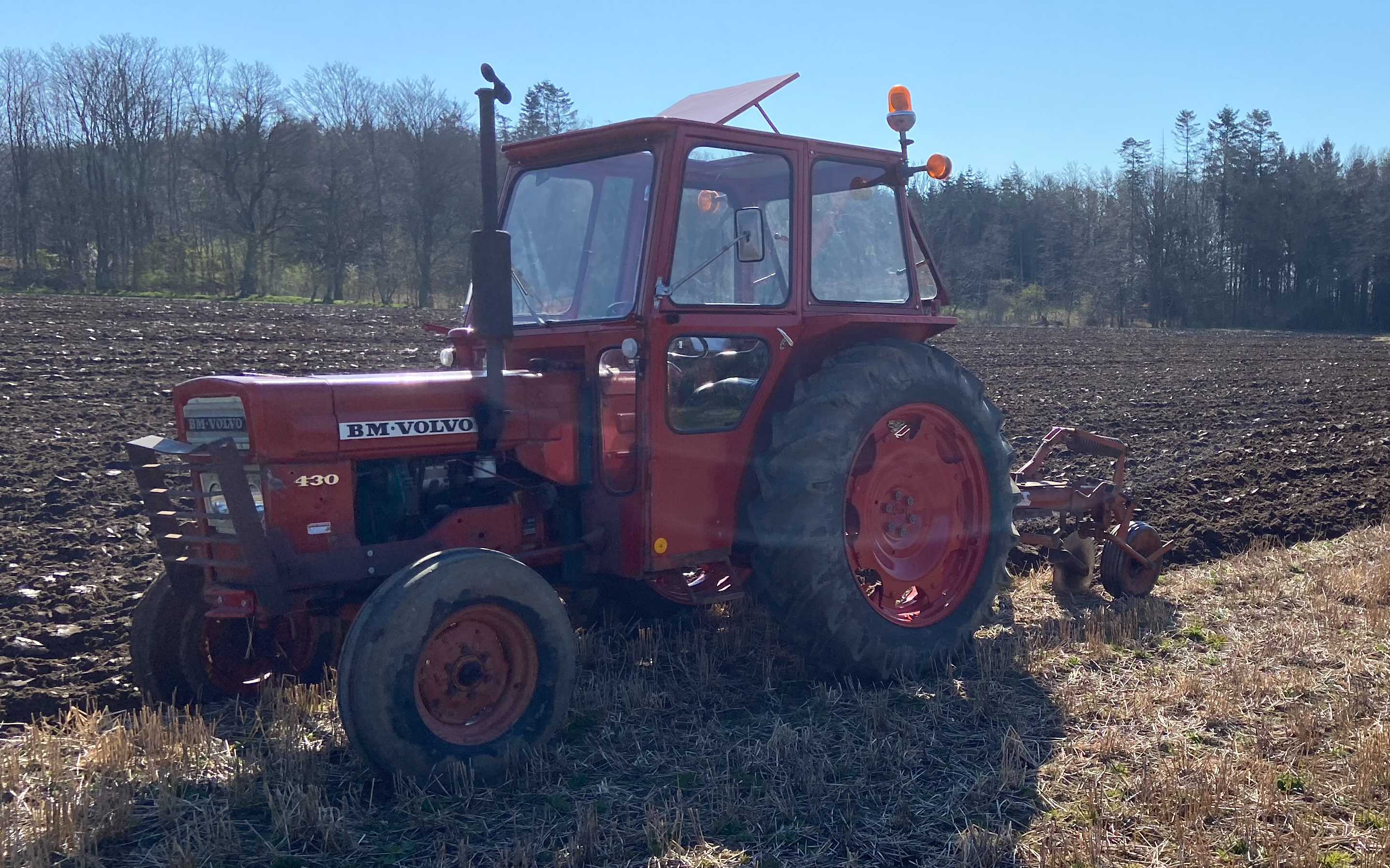 Pløjning af jord med 2 furet Fraugde plov og Volvo 430 tilbydes.