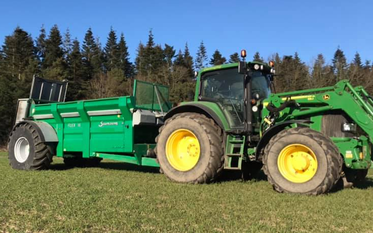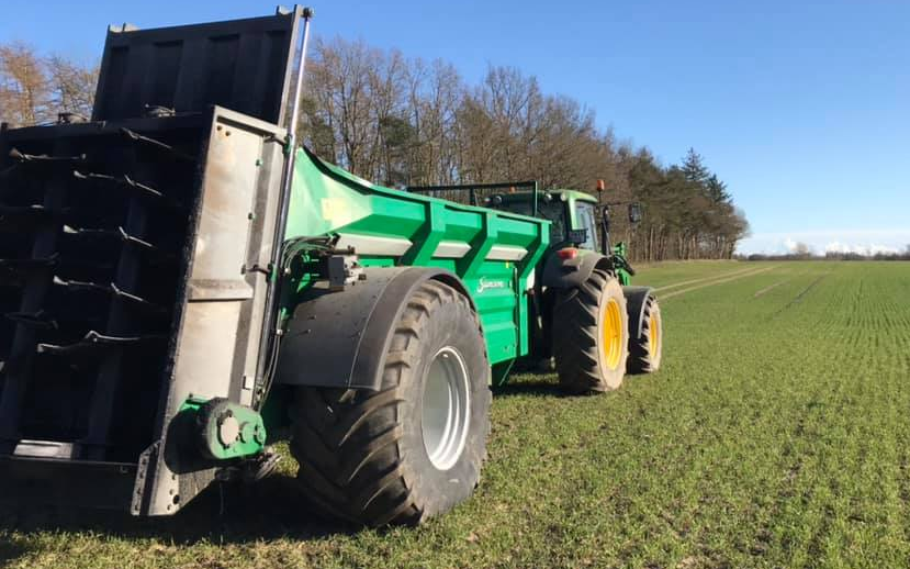 Spredning af staldmøg/kompost mm. Samson spreder med lodrette valser. Bred dækmontering for skånsom overkørsel.
