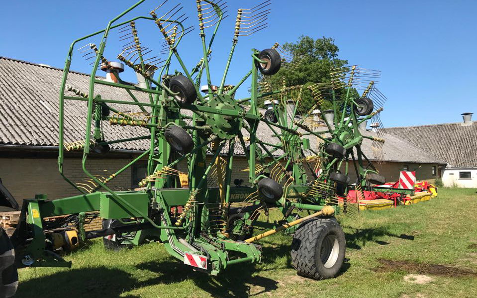 Sammen rivning af hø, halm og græs mm. riven tager 14 meter ad gangen.