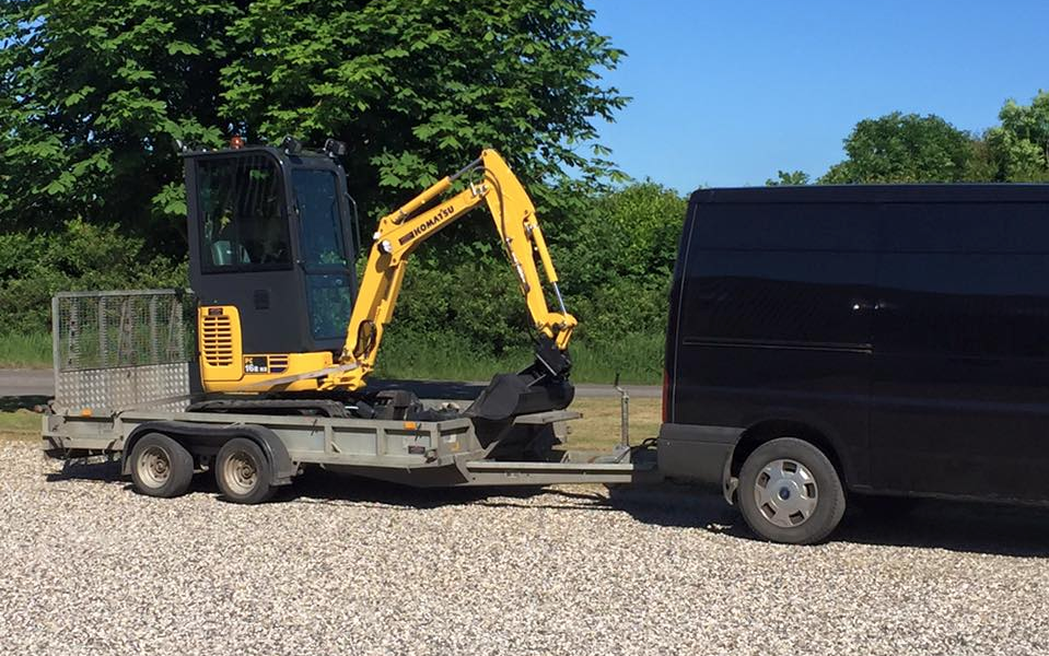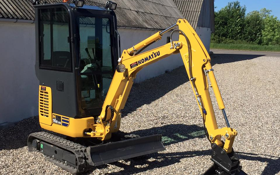 Minigraveren vej 1800 kg og 3 forskellige skovle medfølger. Planer skovlen har tilt.