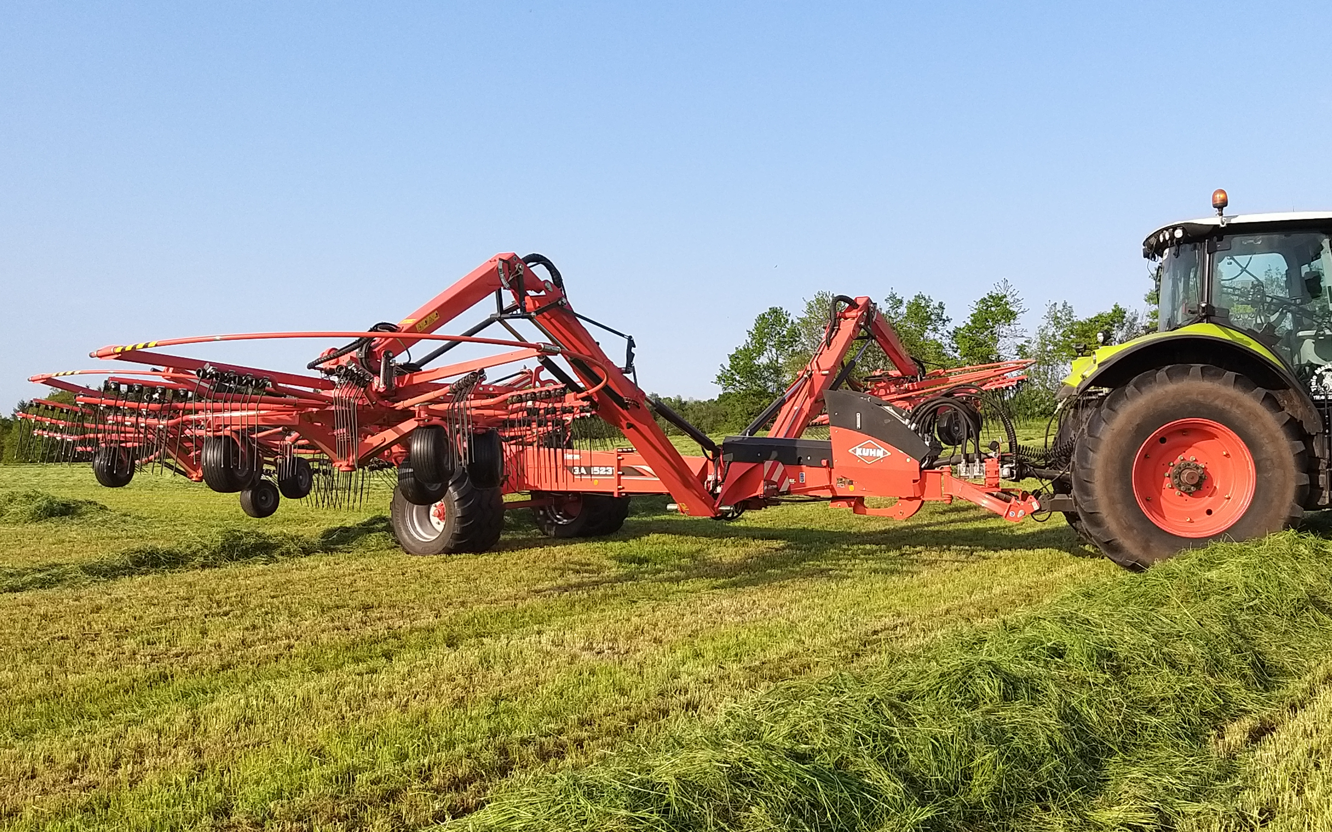 Sammenrivning af græs tilbydes med 4-rotor fuldhydraulisk Kuhn GA 15231 i bredde 9,5-14,7 m. Se mere https://www.mi.dk/produkter/56/rotorriver/nyhed-kuhn-ga-15231-4-rotor-fuldhydraulisk-rive