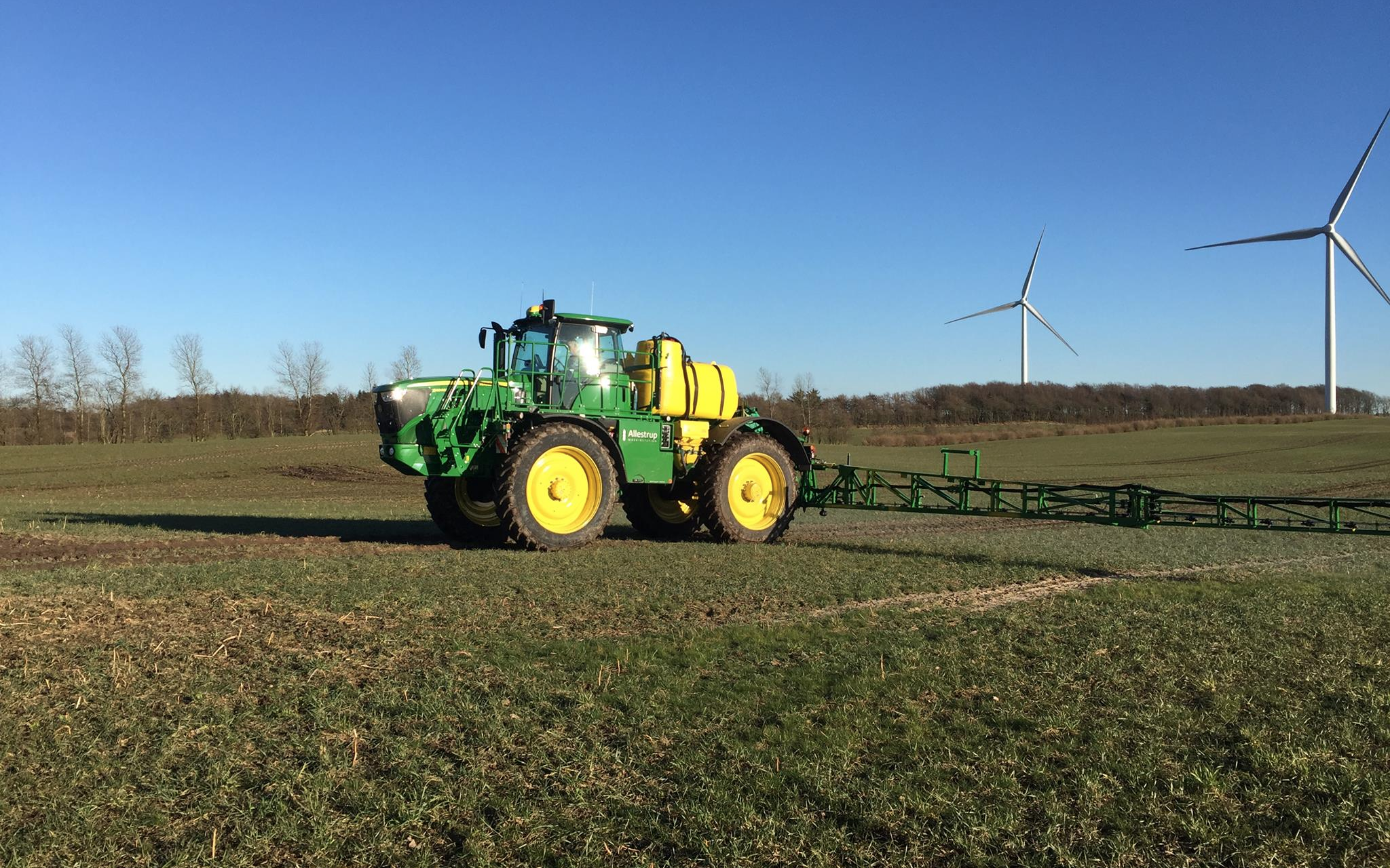 Vores selvkørende sprøjte har en arbejdsbredde på 24-36 meter og en tank op 4.000 l. På bommen er der sensorer der automatisk indstiller højden (højre og venstre), og tilpasser sig derfor områdets konturer. Den egner sig derfor utrolig godt til kuperet terræn, og kan stadig holde en fart på 20 km/t. Bommen har også sektionsaflukning hvilket er med til, at der kun bliver sprøjtet hvor det er nødvendigt.