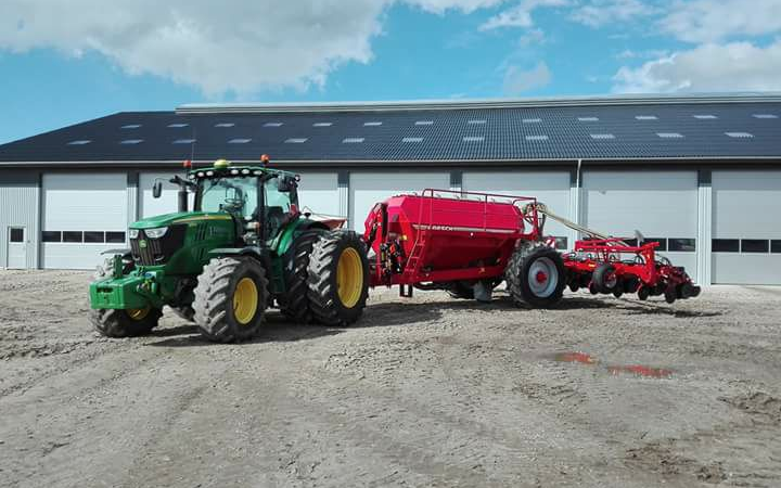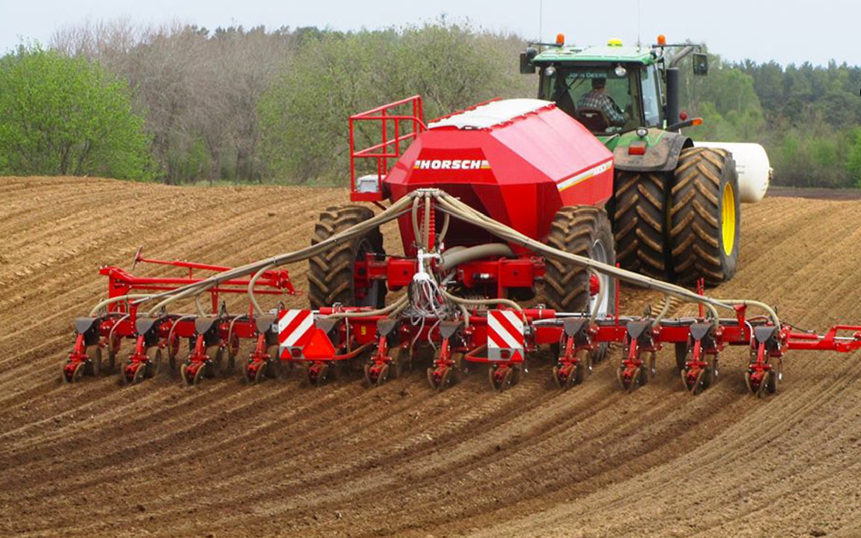 Såning af majs med 12 rækket Horsch enkornsmaskine med skiveskær til frø og gødning. Den laver en meget præcis såning. Vi tilbyder også såning med en 12 rækket Gesprado.
