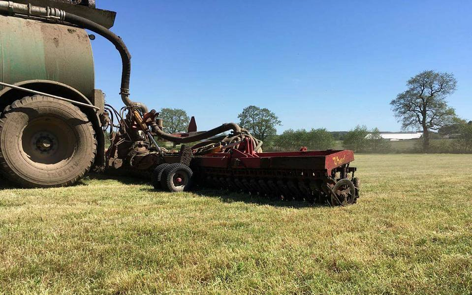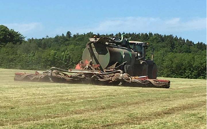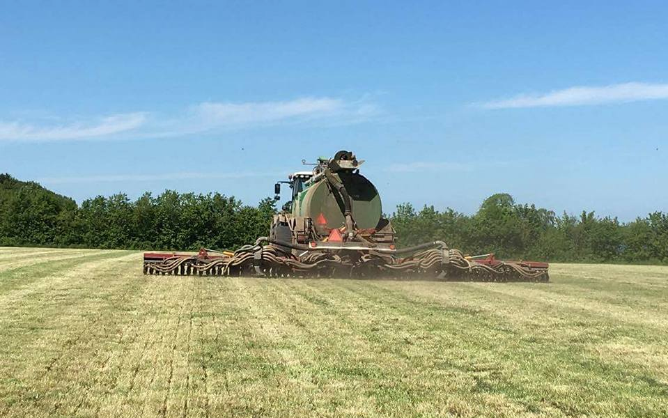 Vi tilbyder græsnedfældning med vores 12 meter Vredo der er spændt på vores SG 23. Gyllevognen har svanehalstrækanordningen der sikre beder vægtfordeling og øget trækydelse.
