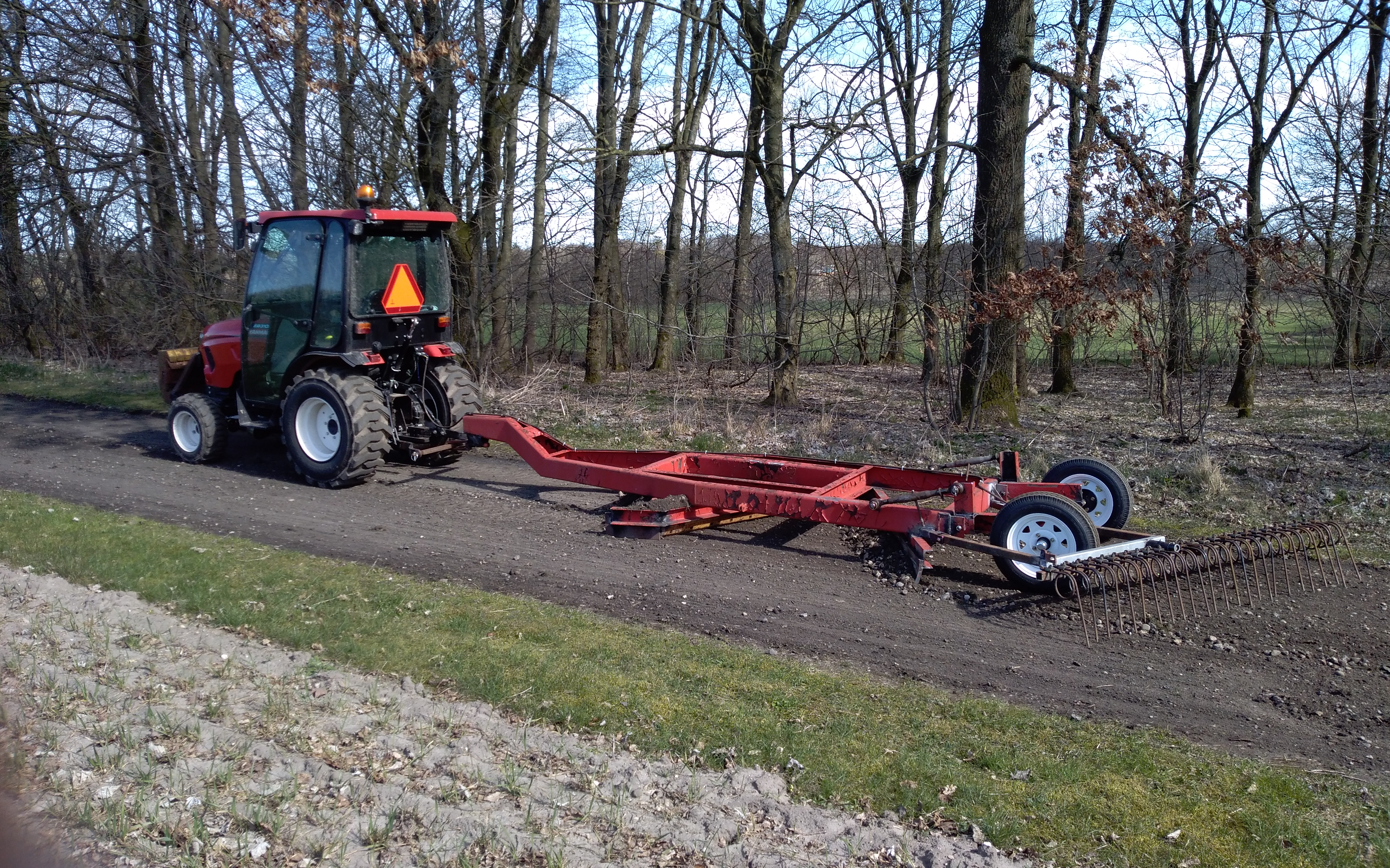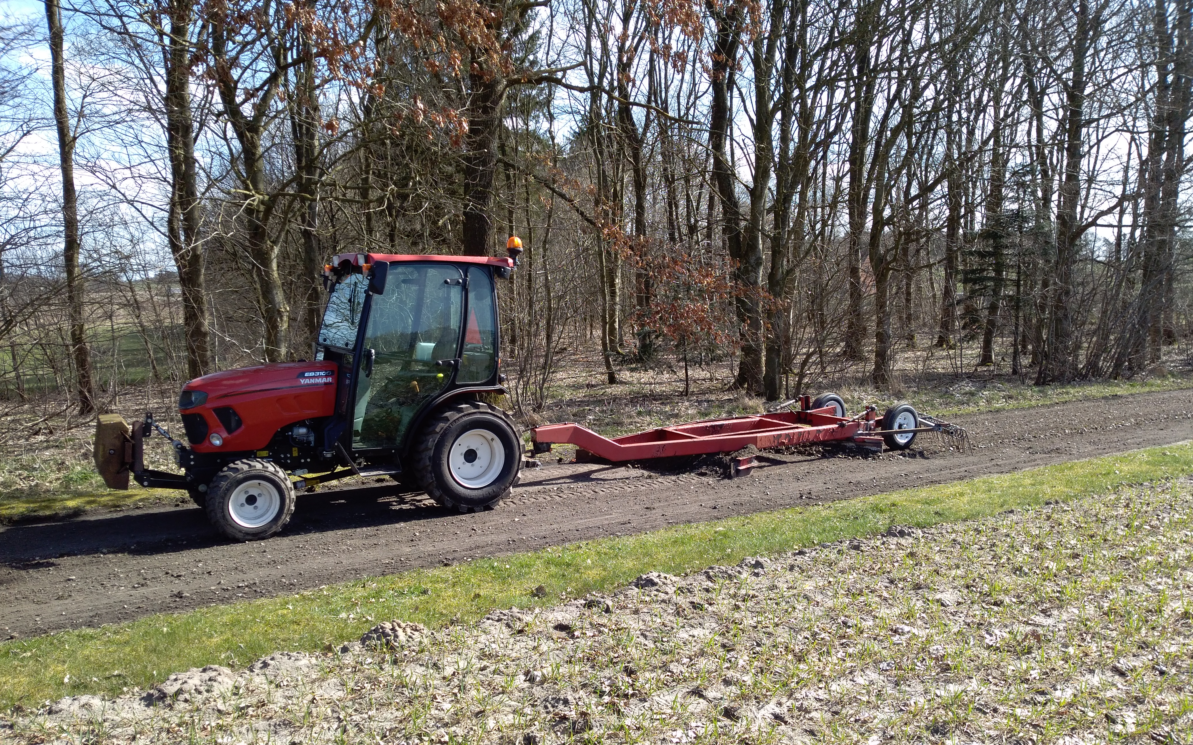 Høvling af grusveje, vejhøvlen kan stilles så der laves fald på vejen, så vandet bedre kan rende af