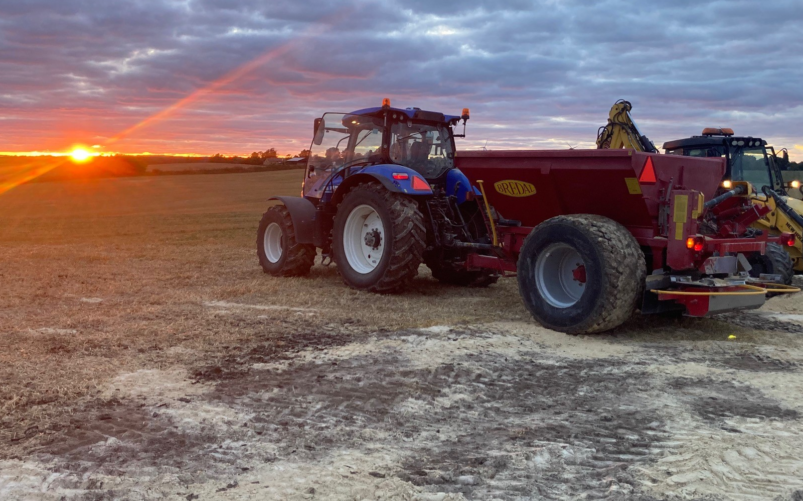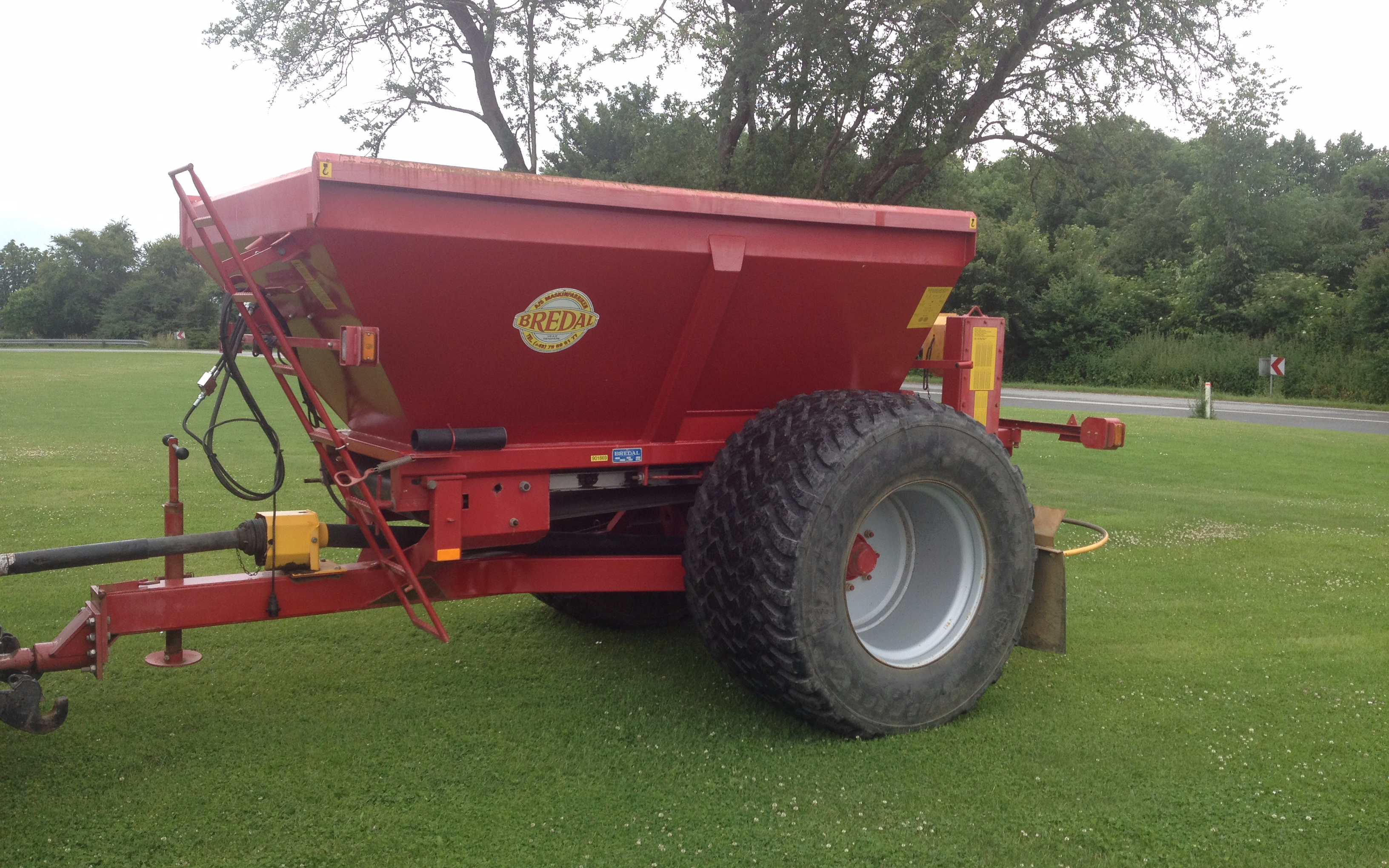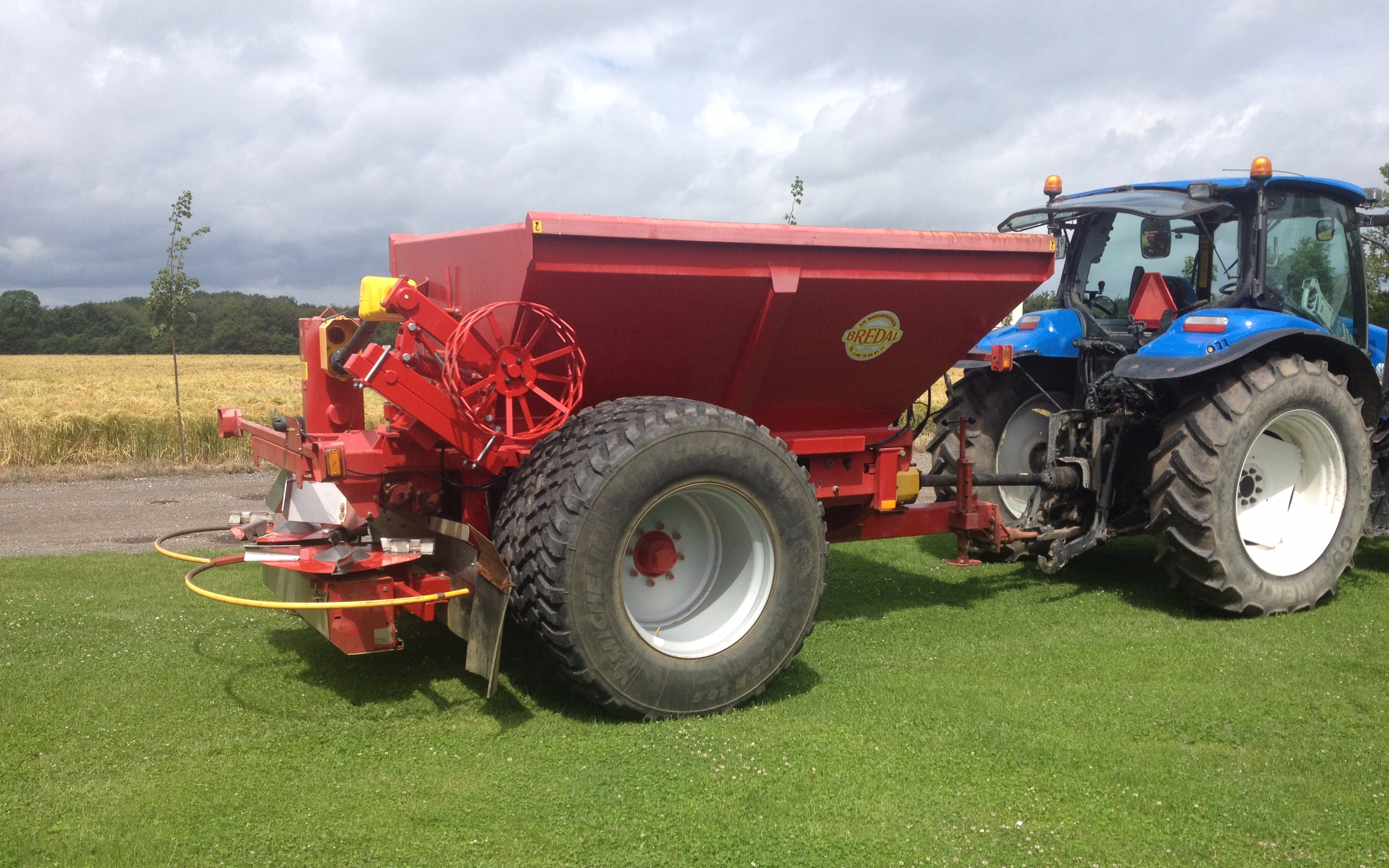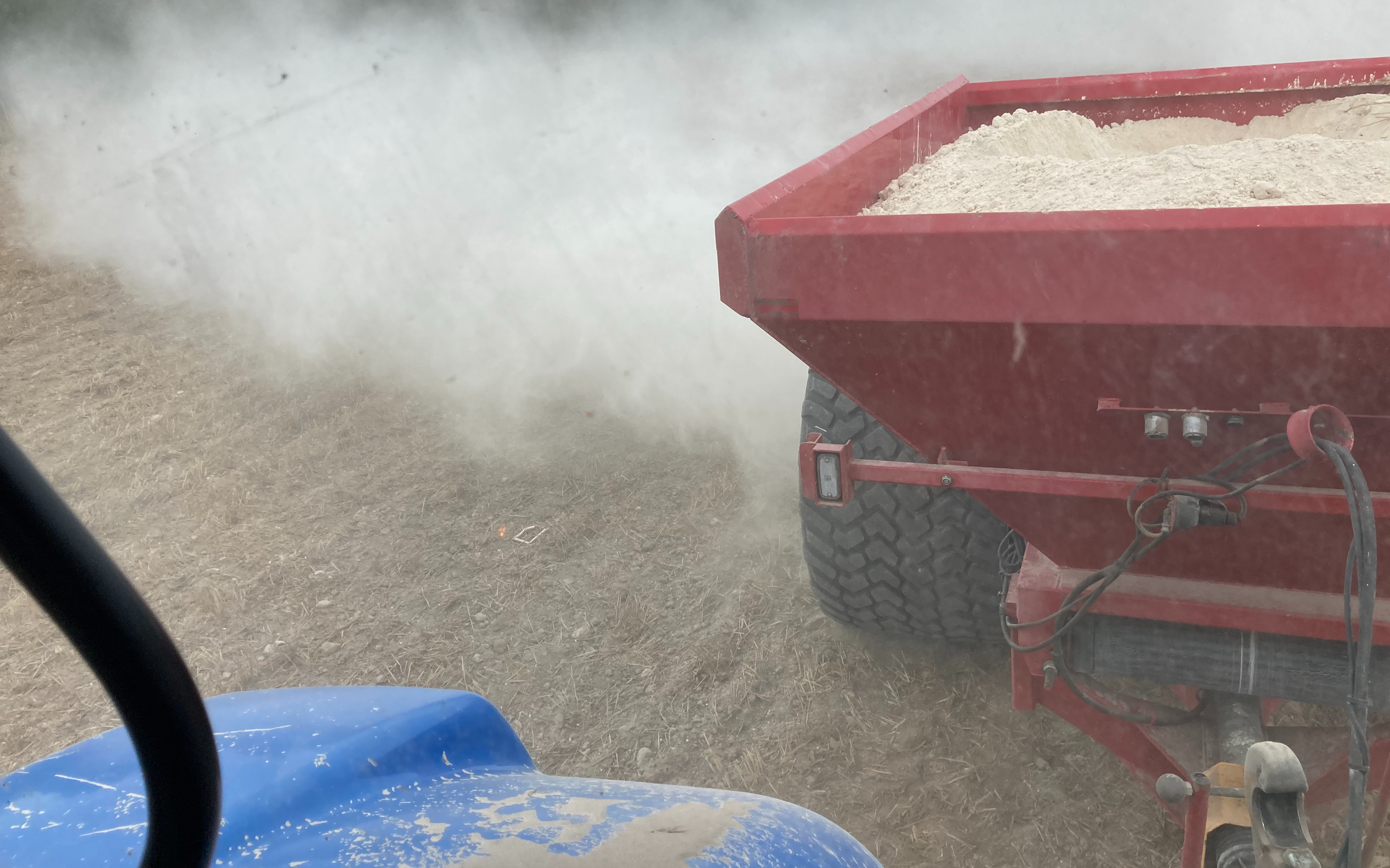 Du kan leje vores kalk-spreder. eller vi kan læsse og sprede din kalk for dig. Den kan sprede kalk på 12-16 m. Der er 800 hjul på den, så den er let at trække for en mindre traktor, så det giver ingen køreskader.