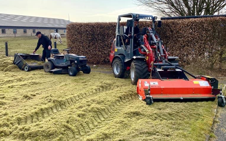 Arbejde med minilæsser udføres. Redskaber: - vertikalskærer - slagleklipper med plæne eller brakknive. - skovl - pallegafler - siloklo