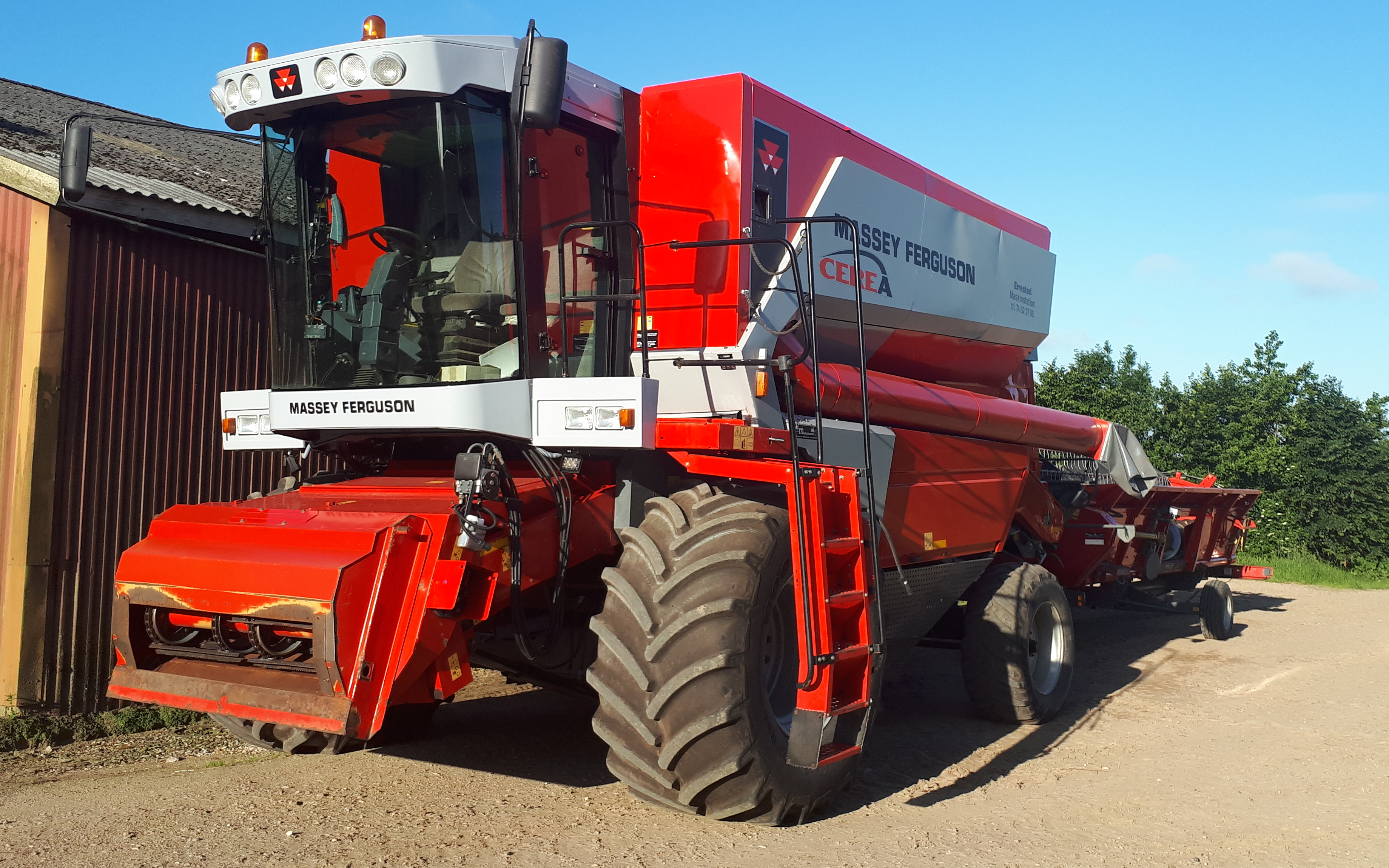 Høst med 2 stk 25 fods mejetærsker hvor den ene er denne MF 7278. Med snitter og powerflow bord. Ring til Poul og få vores priser og et uforpligtende tilbud