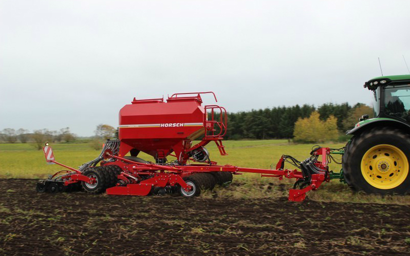 Vores 4 m Pronto med grubber til pløjefri dyrkning med disc og dobbelte skiveskær for gødnings placering og samsåning af kerner og gødning. Dobbelt pakker i fuld bredde og trykruller på såskær for korekt sådybde.