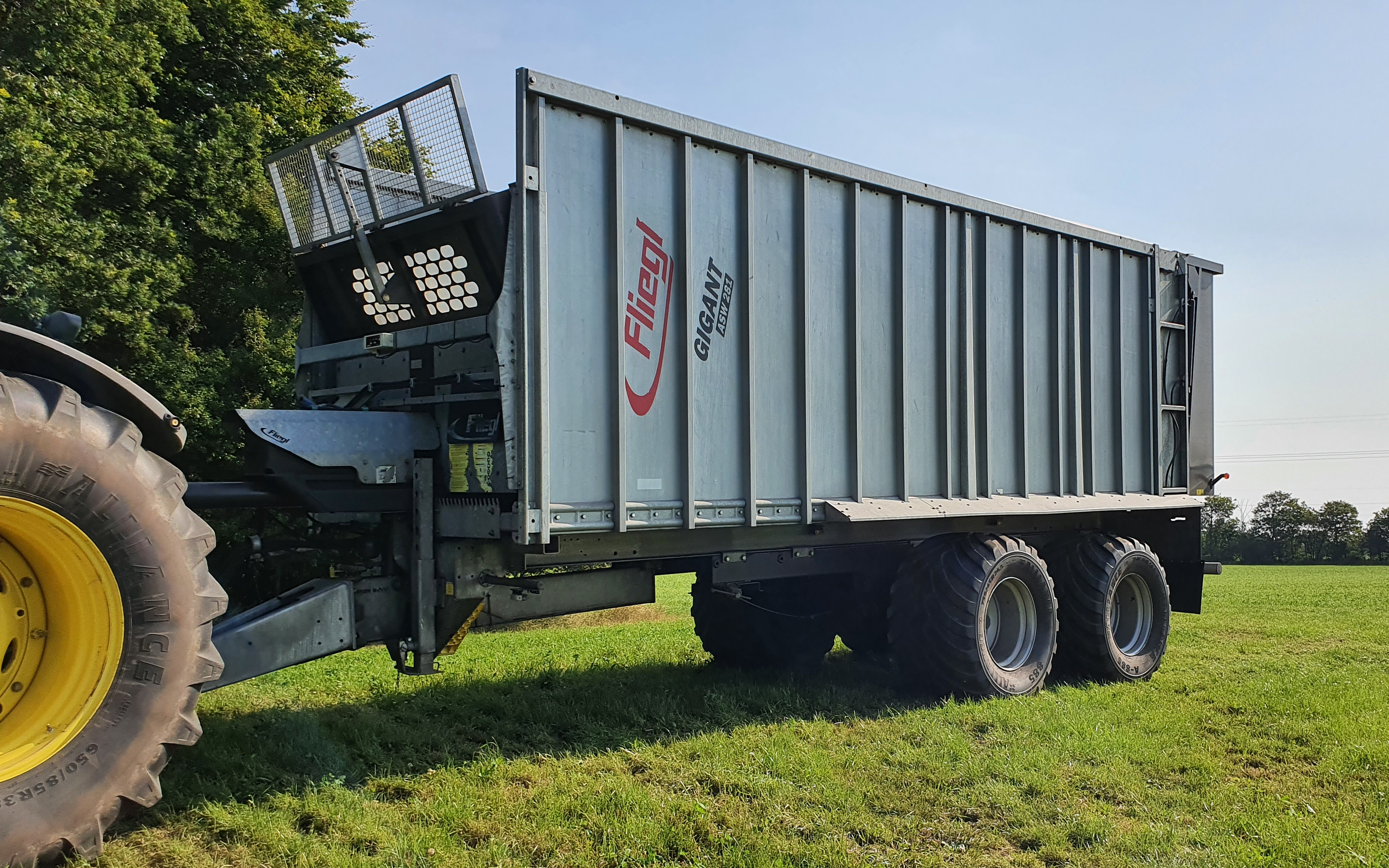 45 m3 fliegl afskubbervogn. Vognen er udstyret med vægt.
