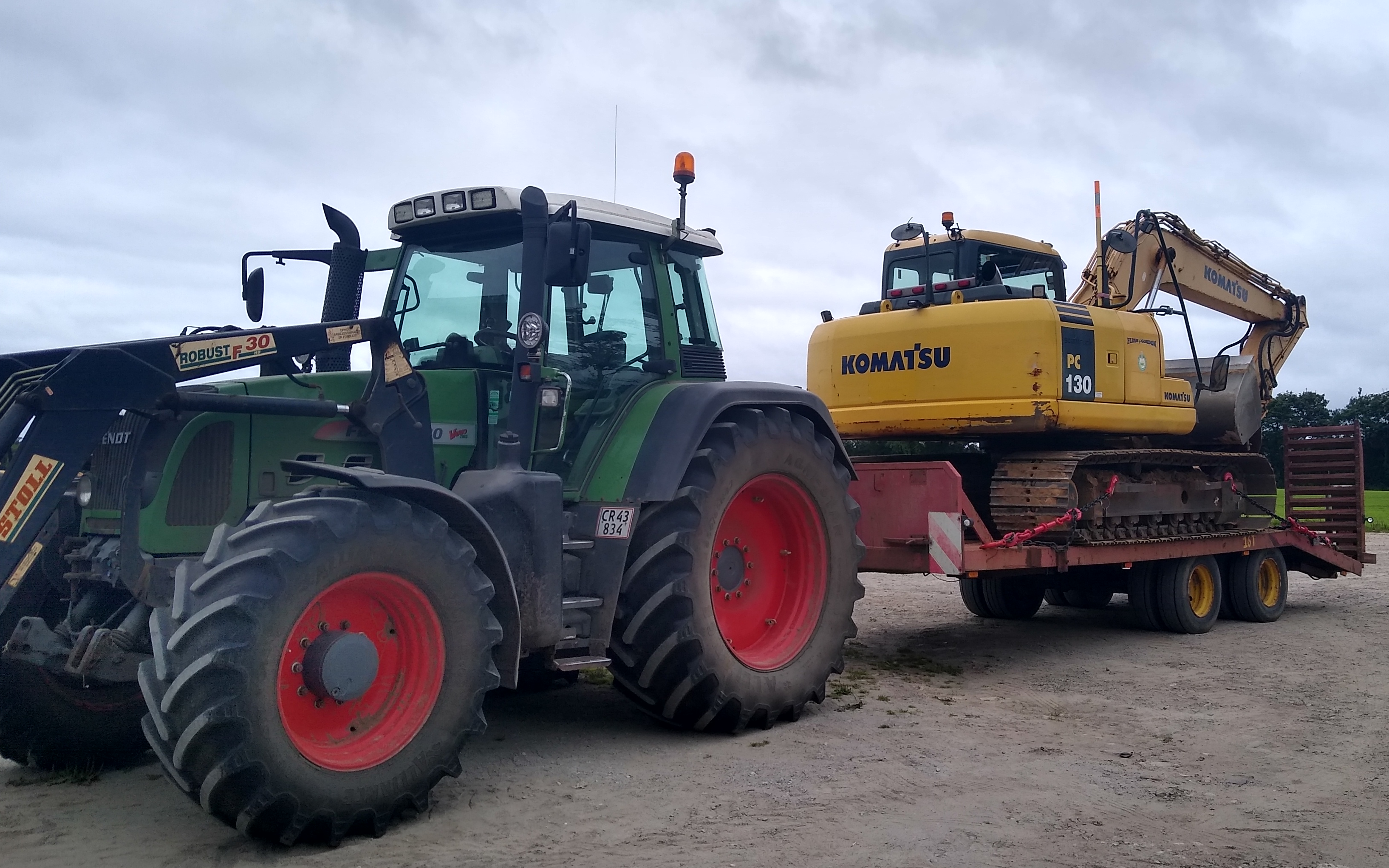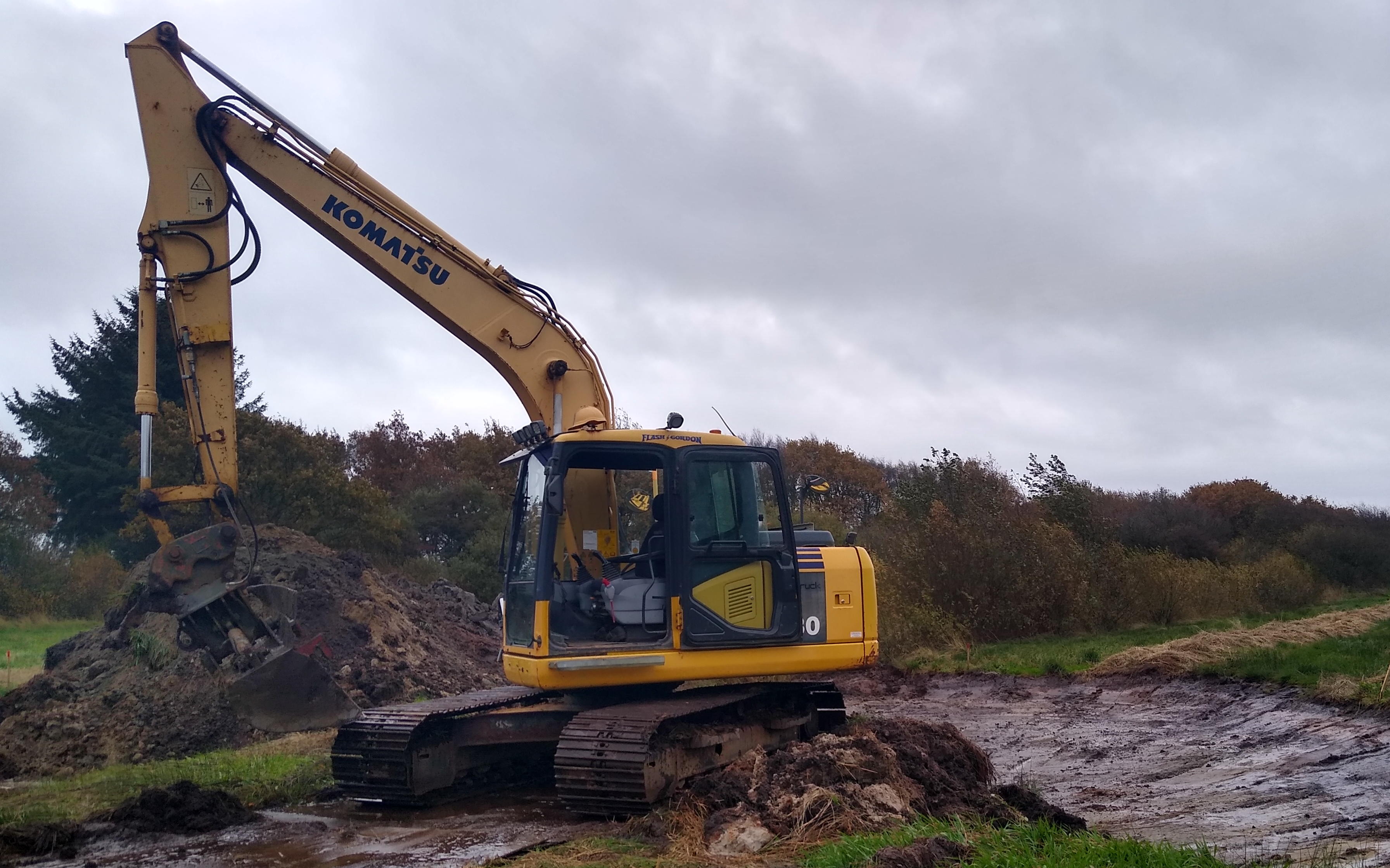 Komatsu gravemaskine, med diverse gravskovle, risteskovl, planer skovl med tilt, sorter grab.