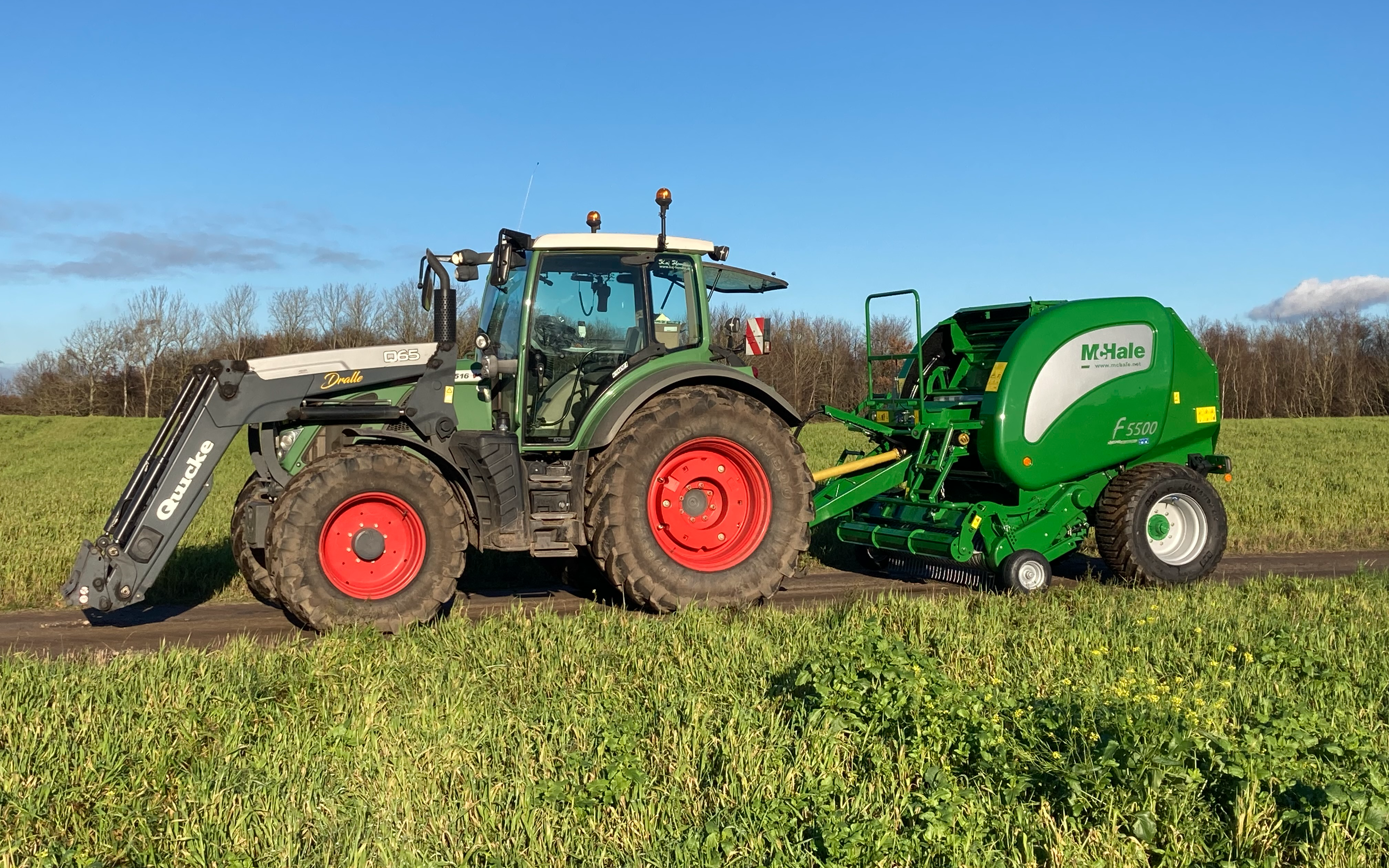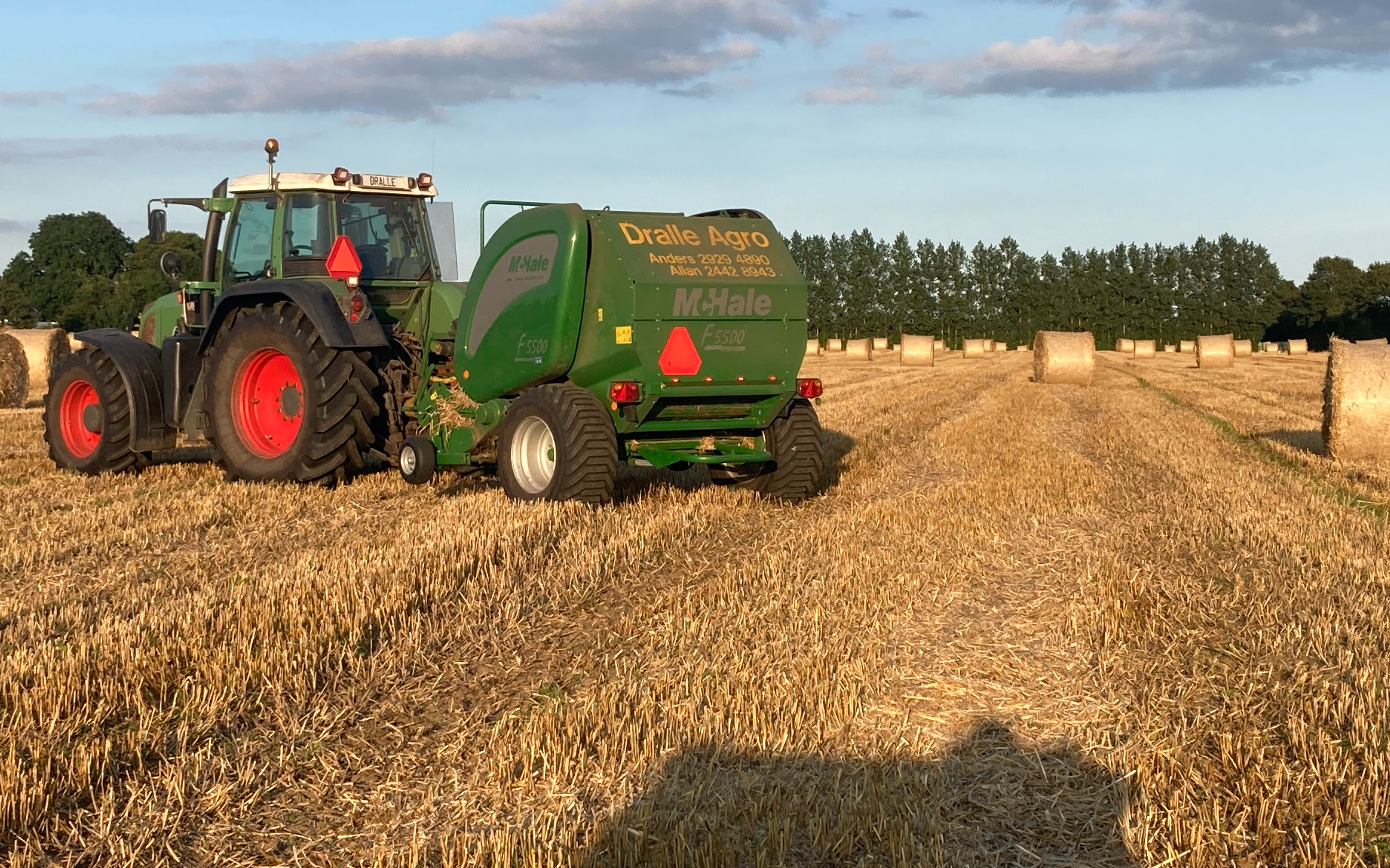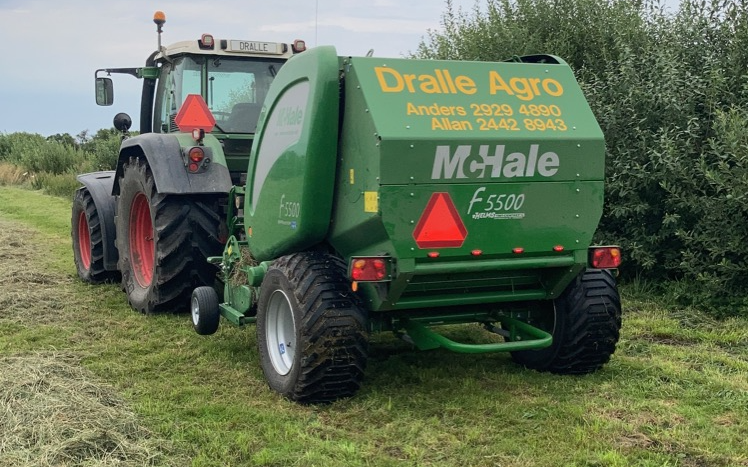 Presning af rundballer i diameter 1,25m. Presseren er med fastkammer og har indbygget snitter med op til 25 knive, vi køre dog mest kun med 13 knive af gangen. Vi presser lige fra vådt wrap græs til tør halm og hø.