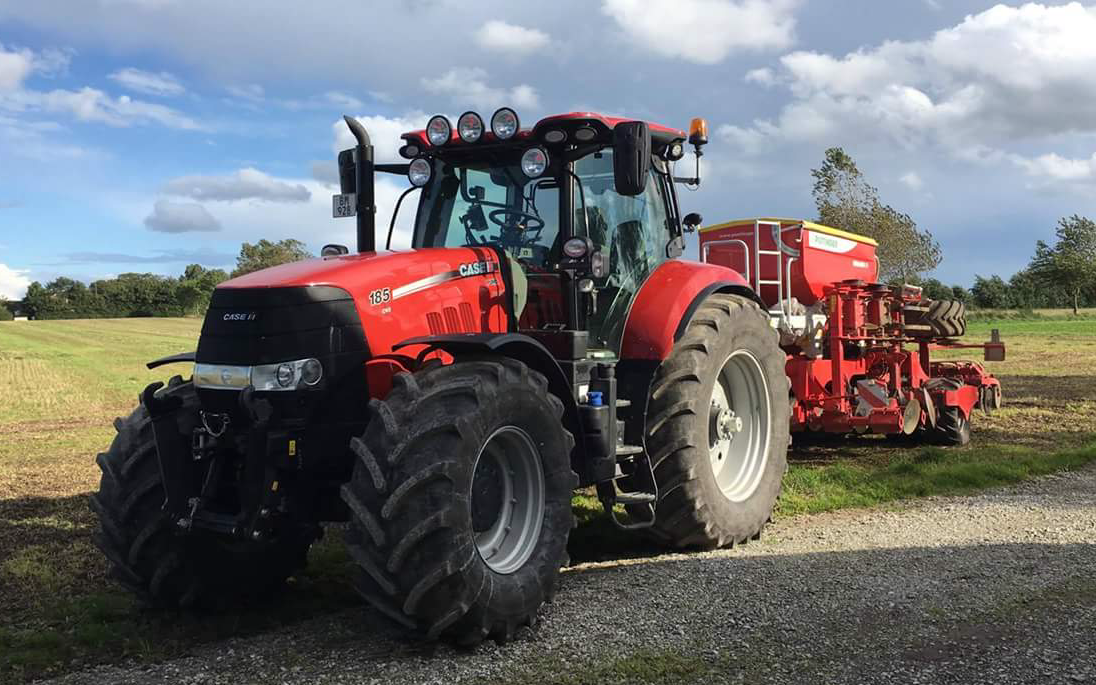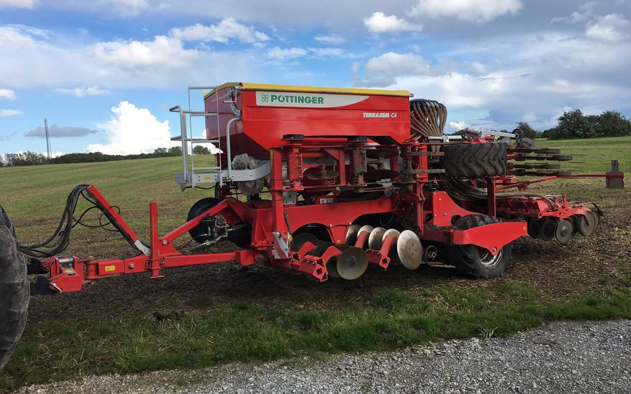 Vi tilbyder såning med 4 meter luftsåmaskine. Maskinens opbygning er først 2 rækker disk, 1 række afjævner, store pakkerhjul og der efter dobbelt skiveskær og trykruller. Traktoren er monteret med tvillingehjul bag og evt. frontpakker.