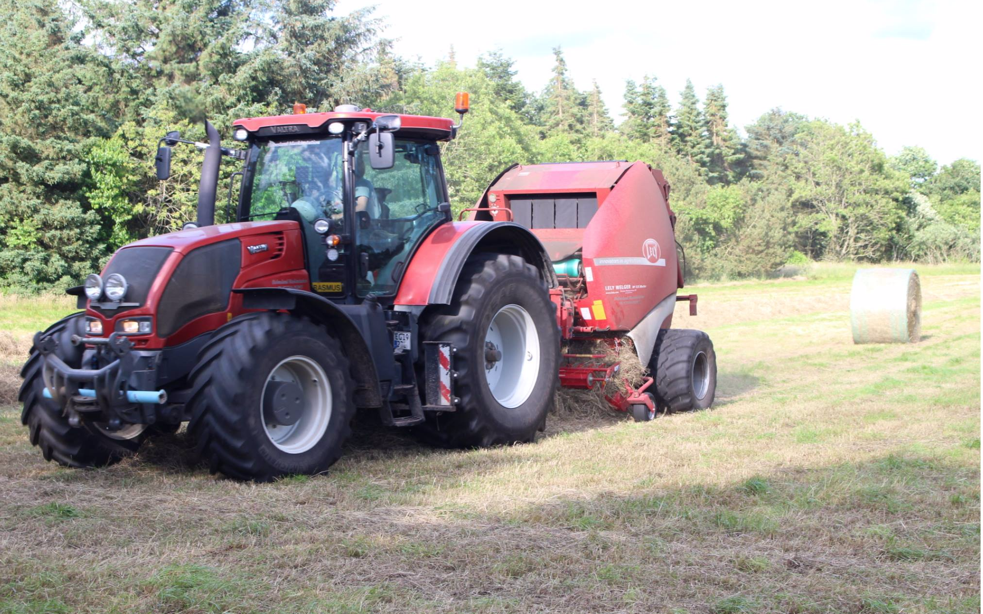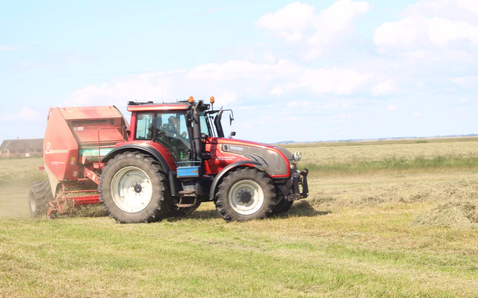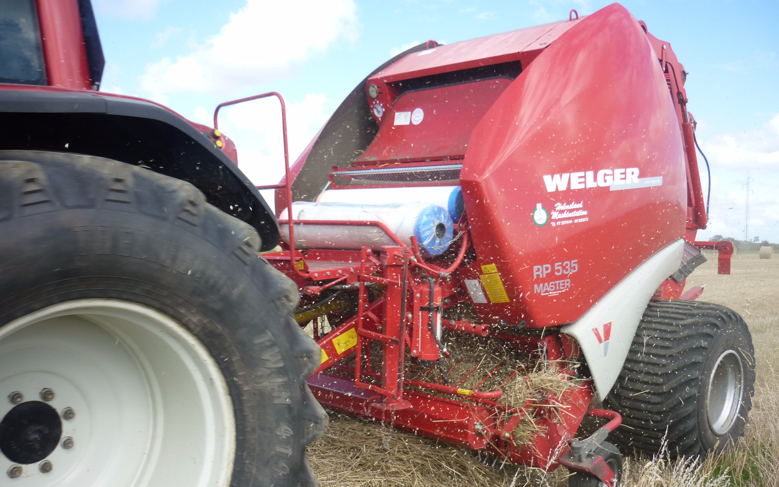 Effektiv rundballepresser der presser ballerne i 1,1 - 2 meter i diameteren.