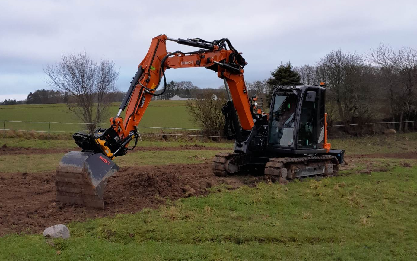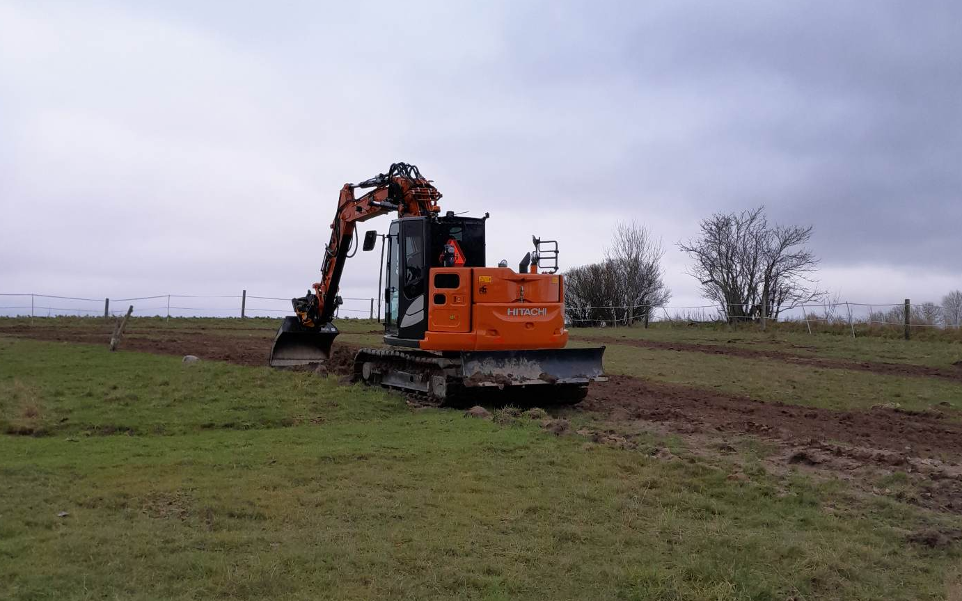 alt arbejde udføres med 9 tons gravemaskine med alt i skovle samt rotortilt og 3D GPS styring