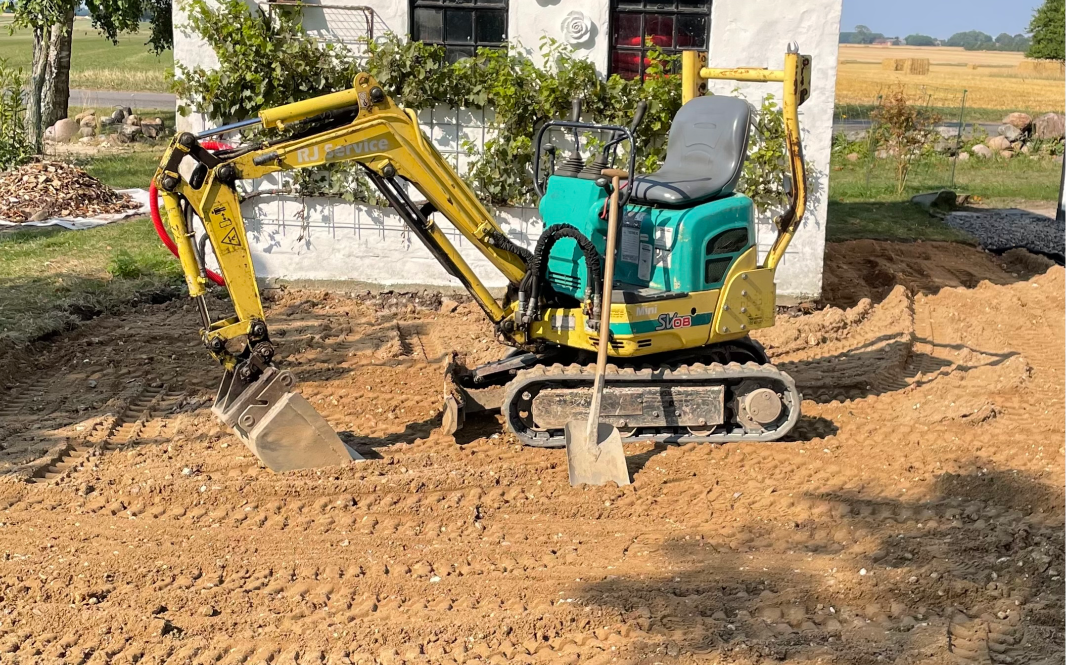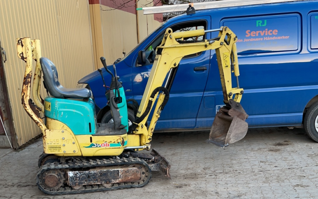 1 tons minigraver med skovle: 20 30 40 100 cm og 60cm risteskovl Kan blive ned til 71 cm bred
