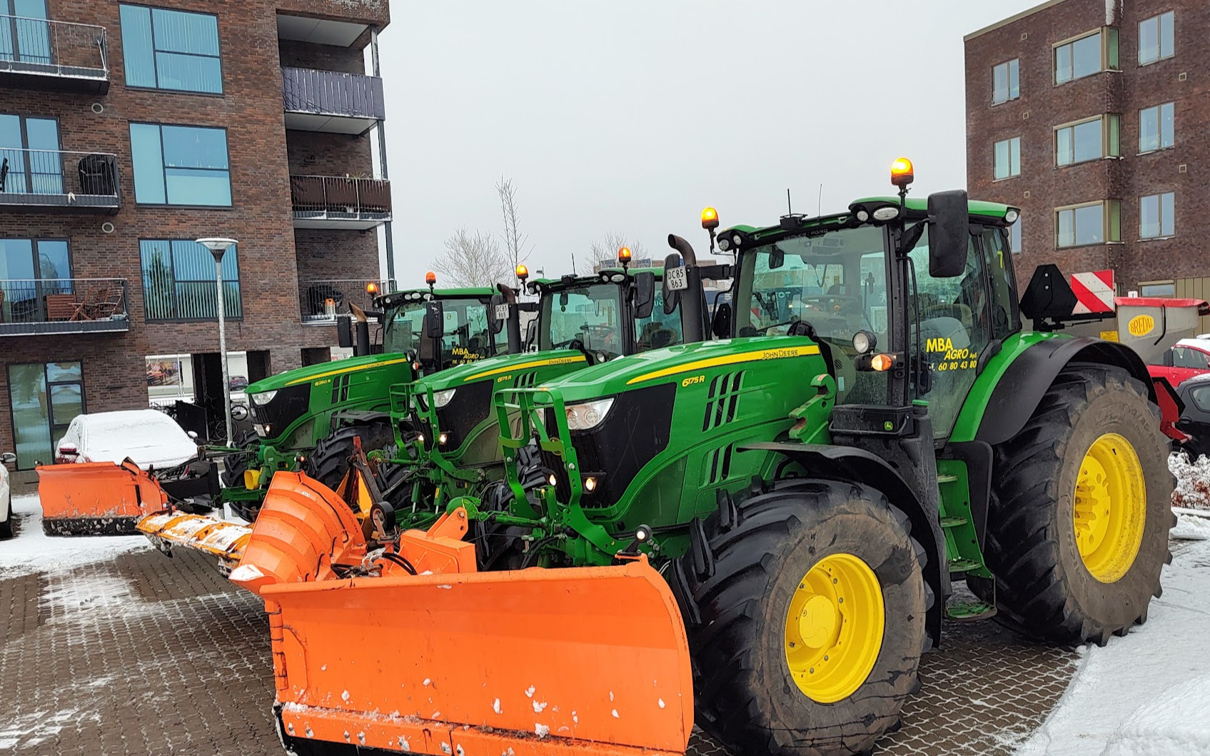 Snerydning med traktorer og sneskraper.