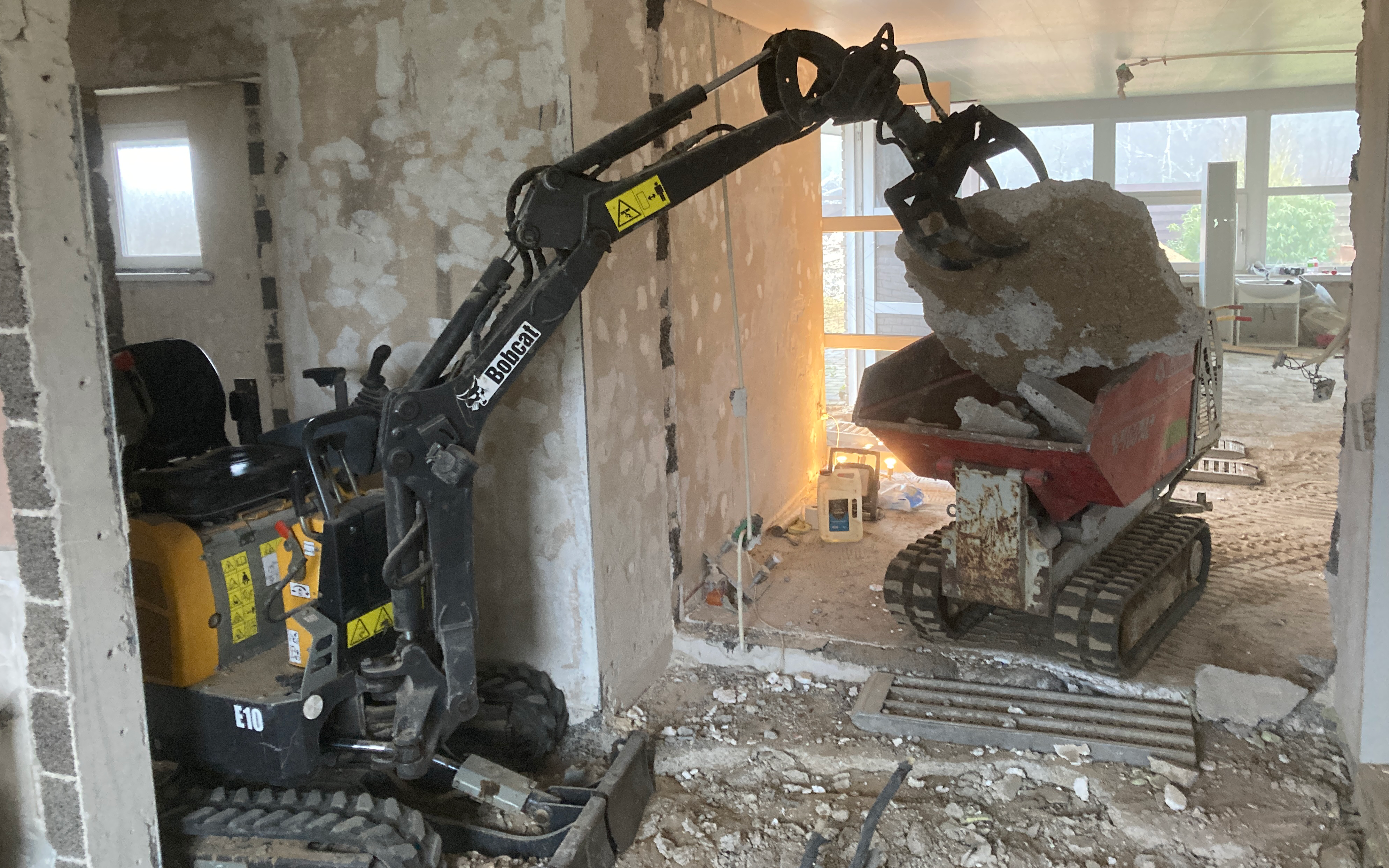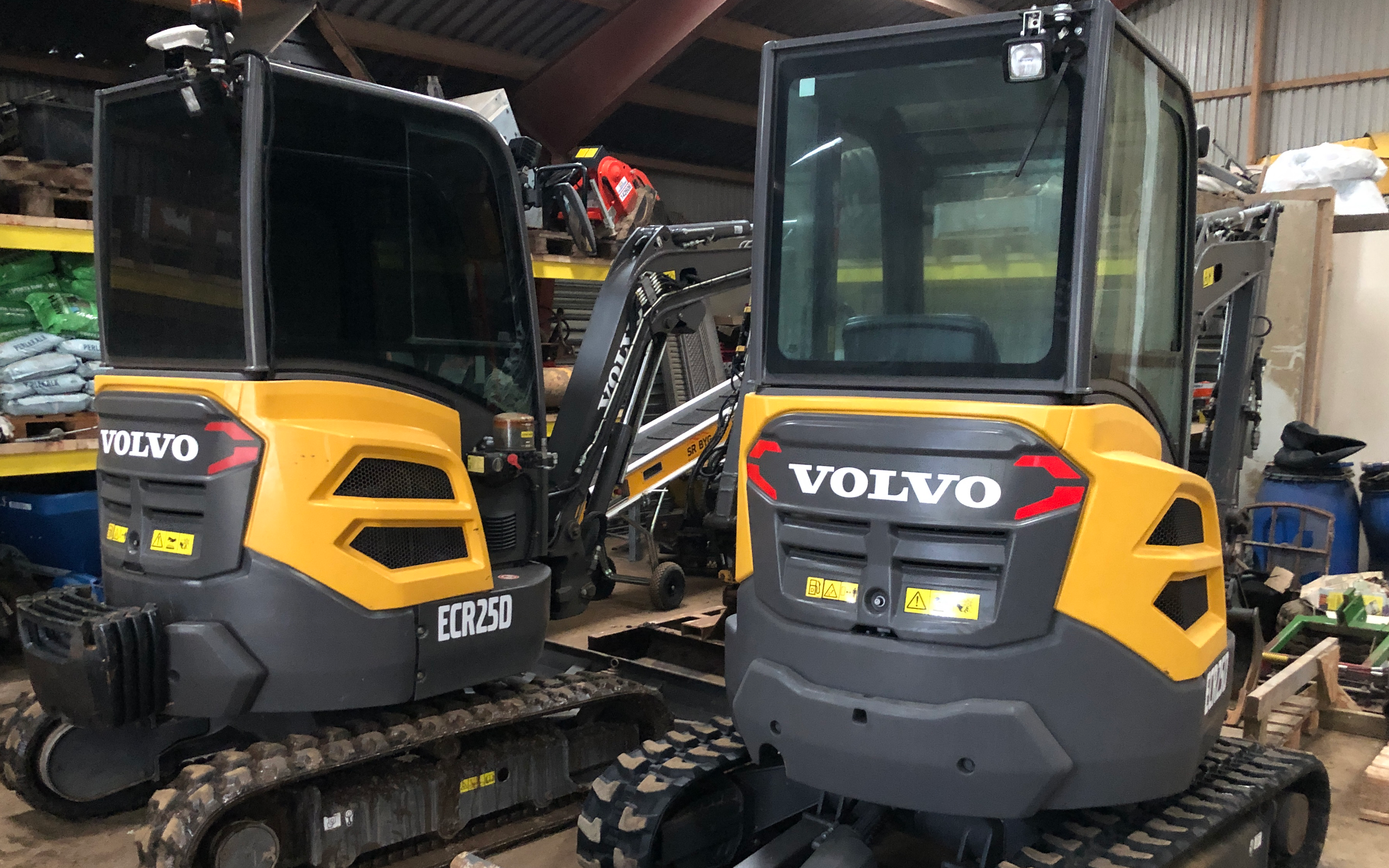 Minigraverarbejde med meget forskelligt tilbehør udføres. Den lille kan komme ind på blot 80cm Volvo kræver 60cm og er udstyret med Rotortilt og maskinstyring