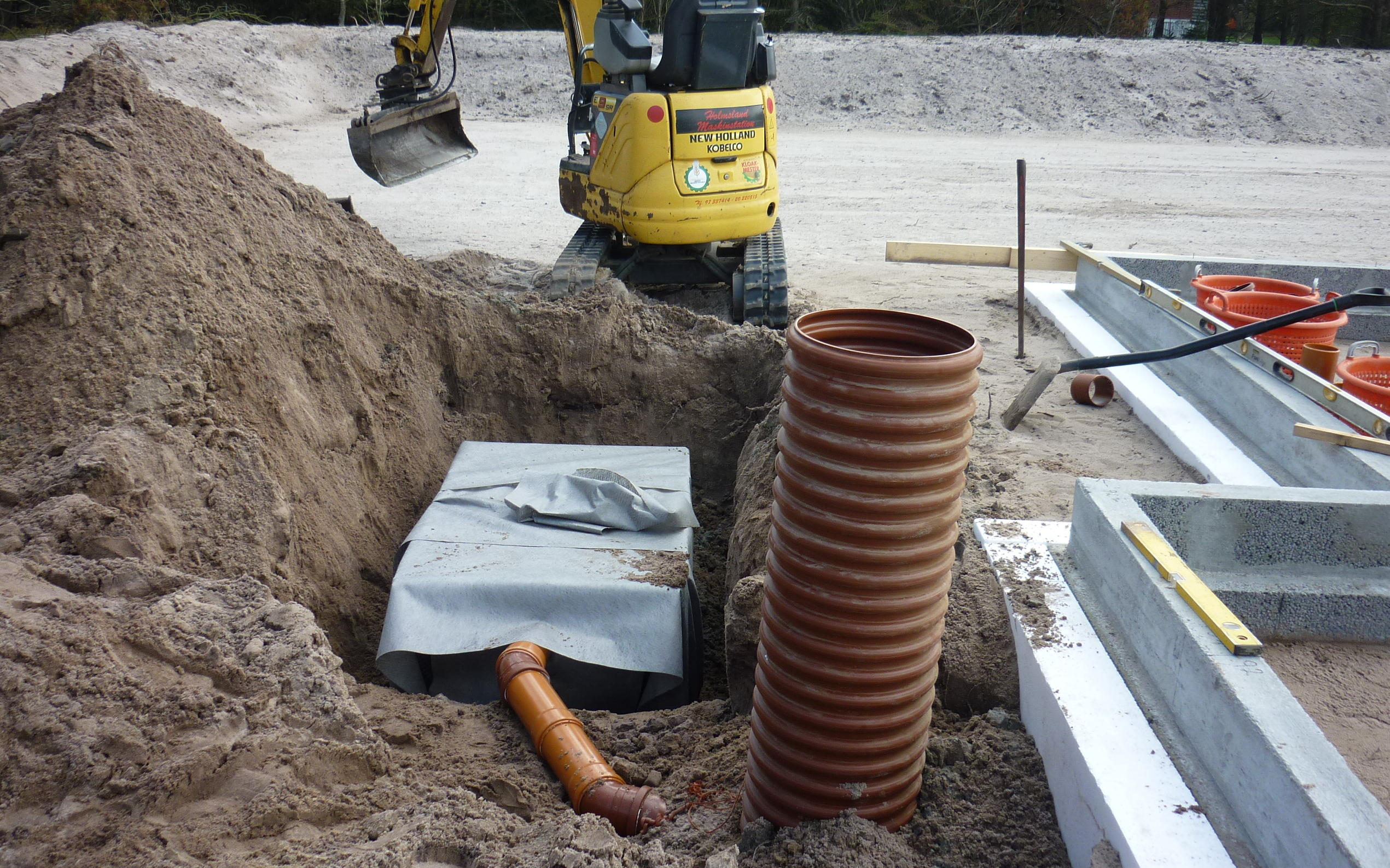 Tagvand og overfladevand føres til faskiner. Beholder hvor vandet opmaksimeres til det trækker i jorden.