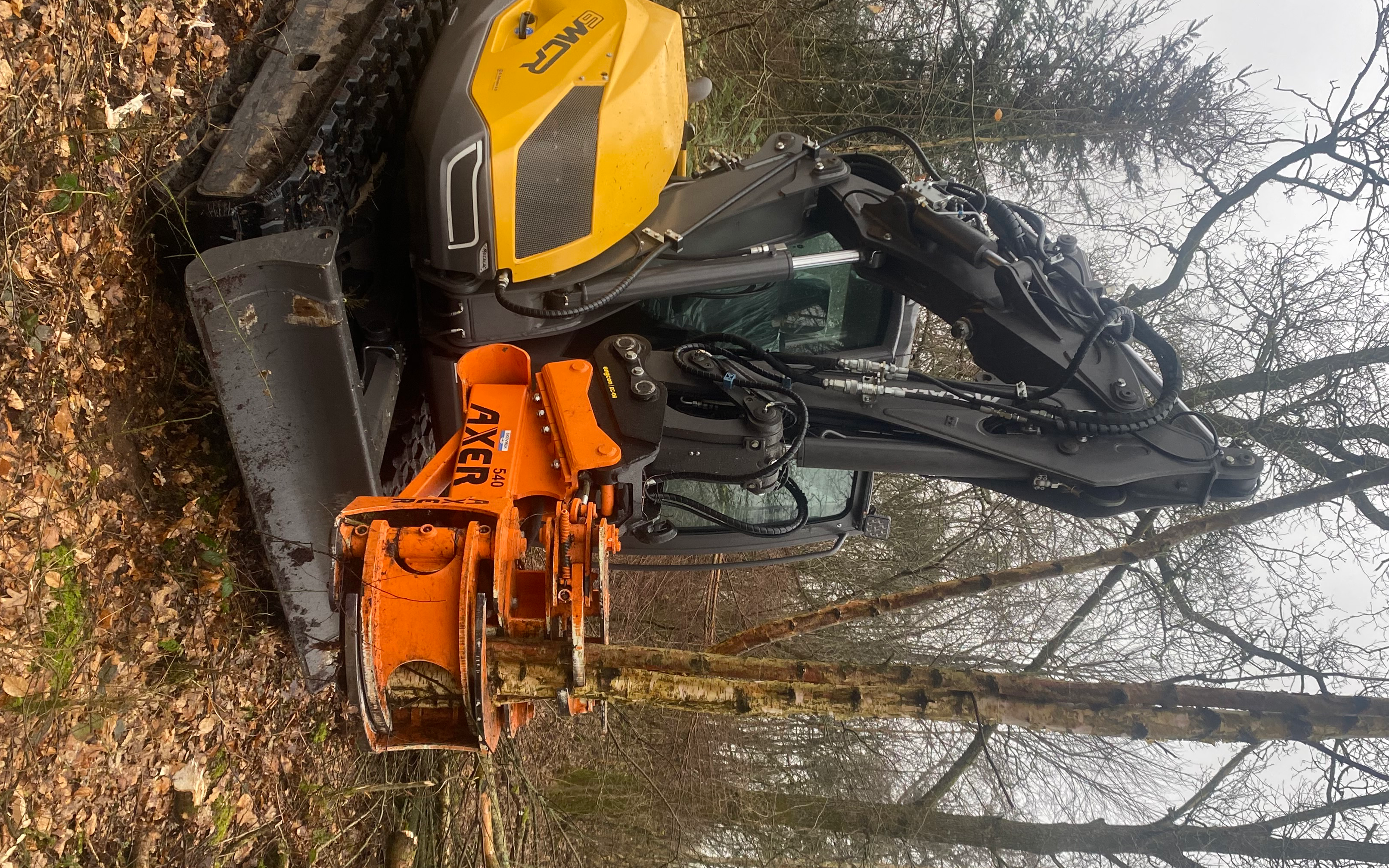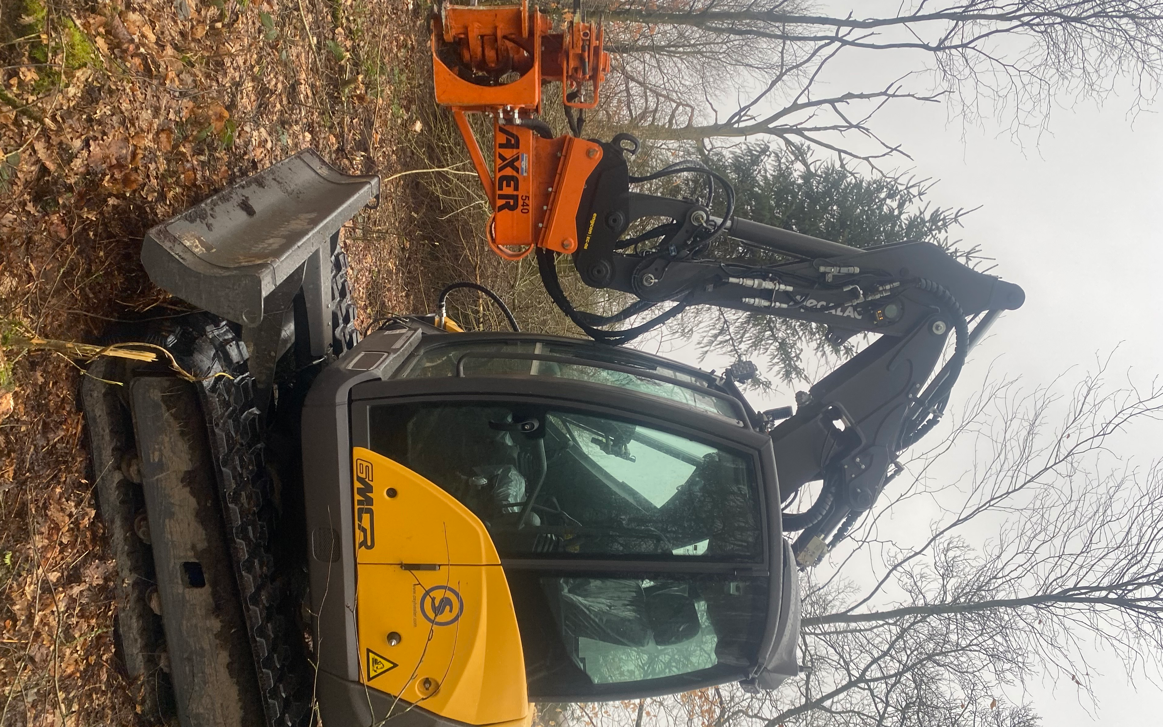Hurtig lille gravemaskine, perfekt til Sporlægning og oprydning af arealer med klipper Axer 540 med akkumulering op til 25 cm. Til stører træer bruger vi sav Mecanil Sg 210 op til 55 cm Maskinen kører 11 km/t på gummibånd