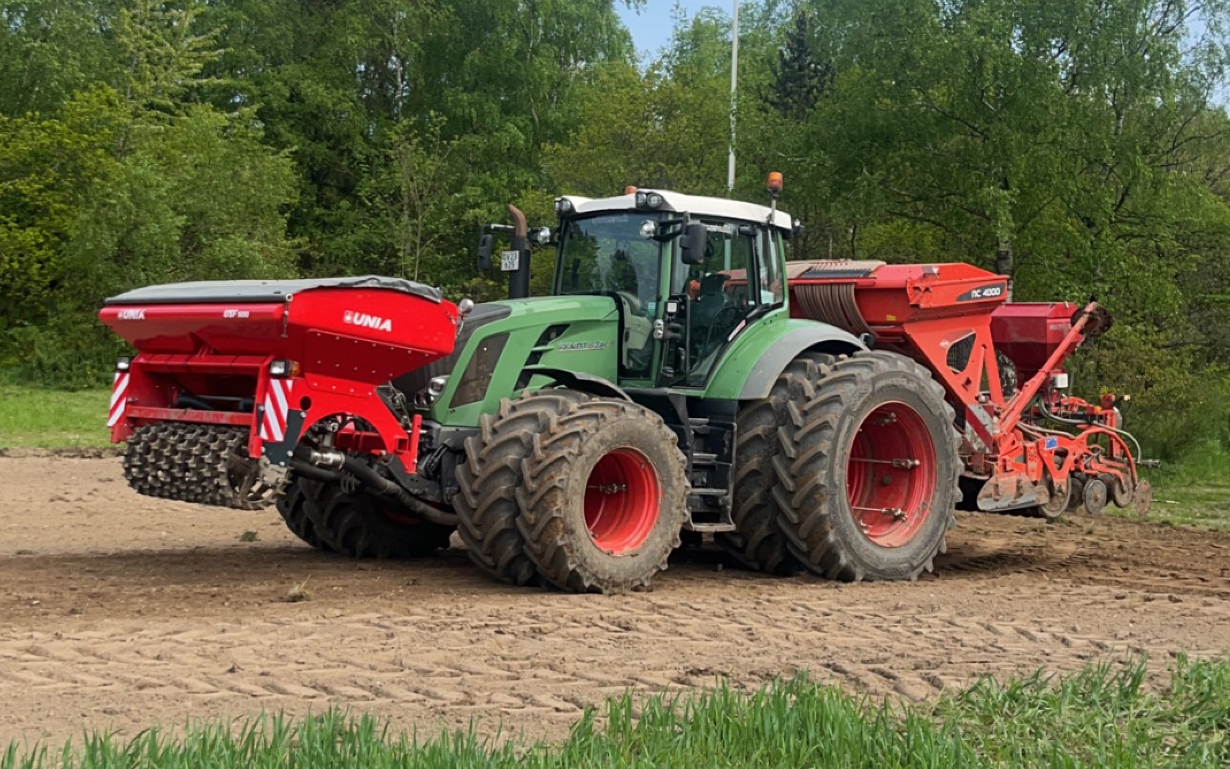 Såmaskinen er udstyret med rotorharve og skiveskær. Mulighed for placering af gødning og såning af græs i samme overkørsel.