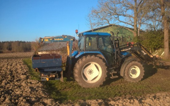 Bøgballe EXW Trend gødningsspreder med kran. Vi spreder gødning. Vi kan også levere gødningen.