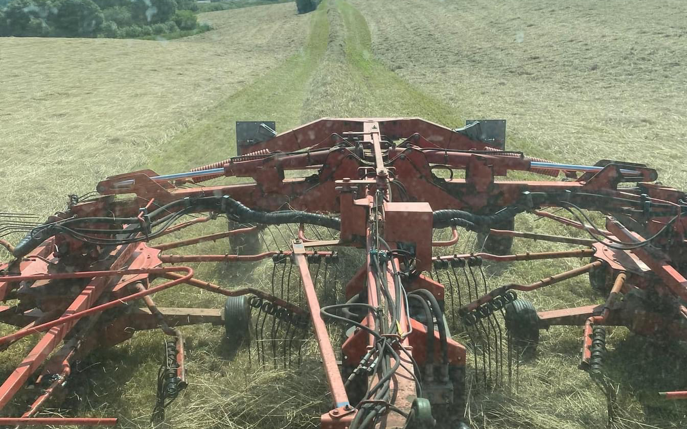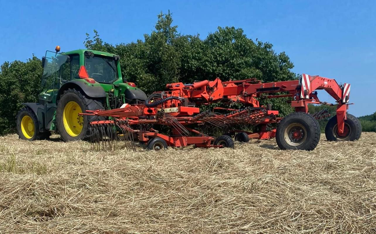 8 meter rive, som kan gøres til 9 meter. Vi kan samle både hø og halm Der er gps på traktoren så der ikke bliver misset noget