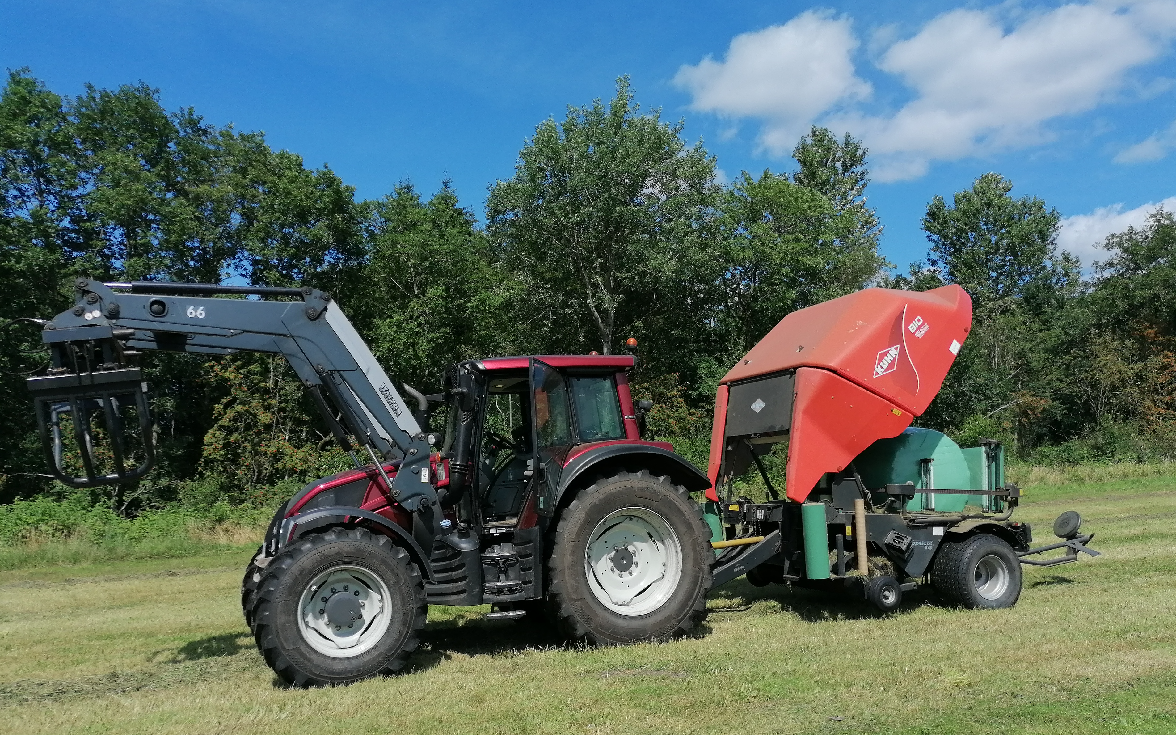 Presning af hø/wrap med letvægts maskine 3T. Balle størrelse 122x125cm. Ring for nærmere info.