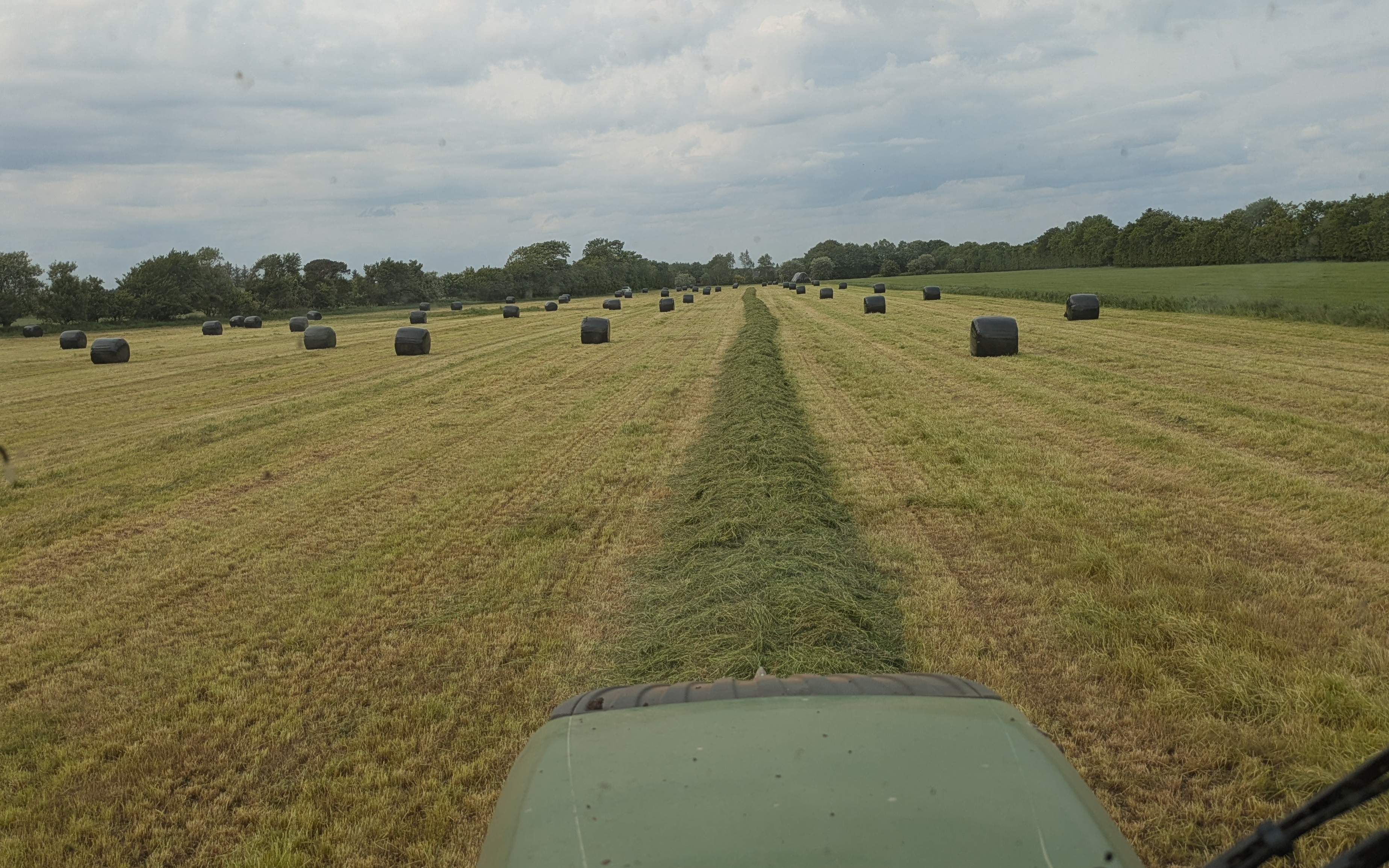Vi kører med Krone Comprima, med variable kammer. Det gør at vi kan lave rundballer fra 1 meter i diameter og op til 1,50meter