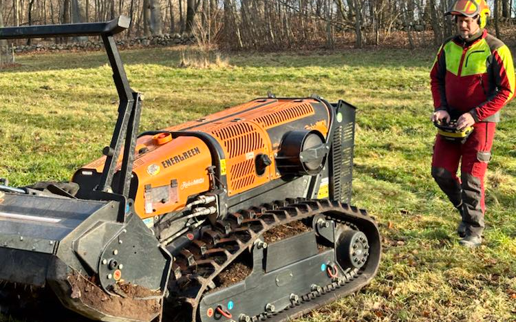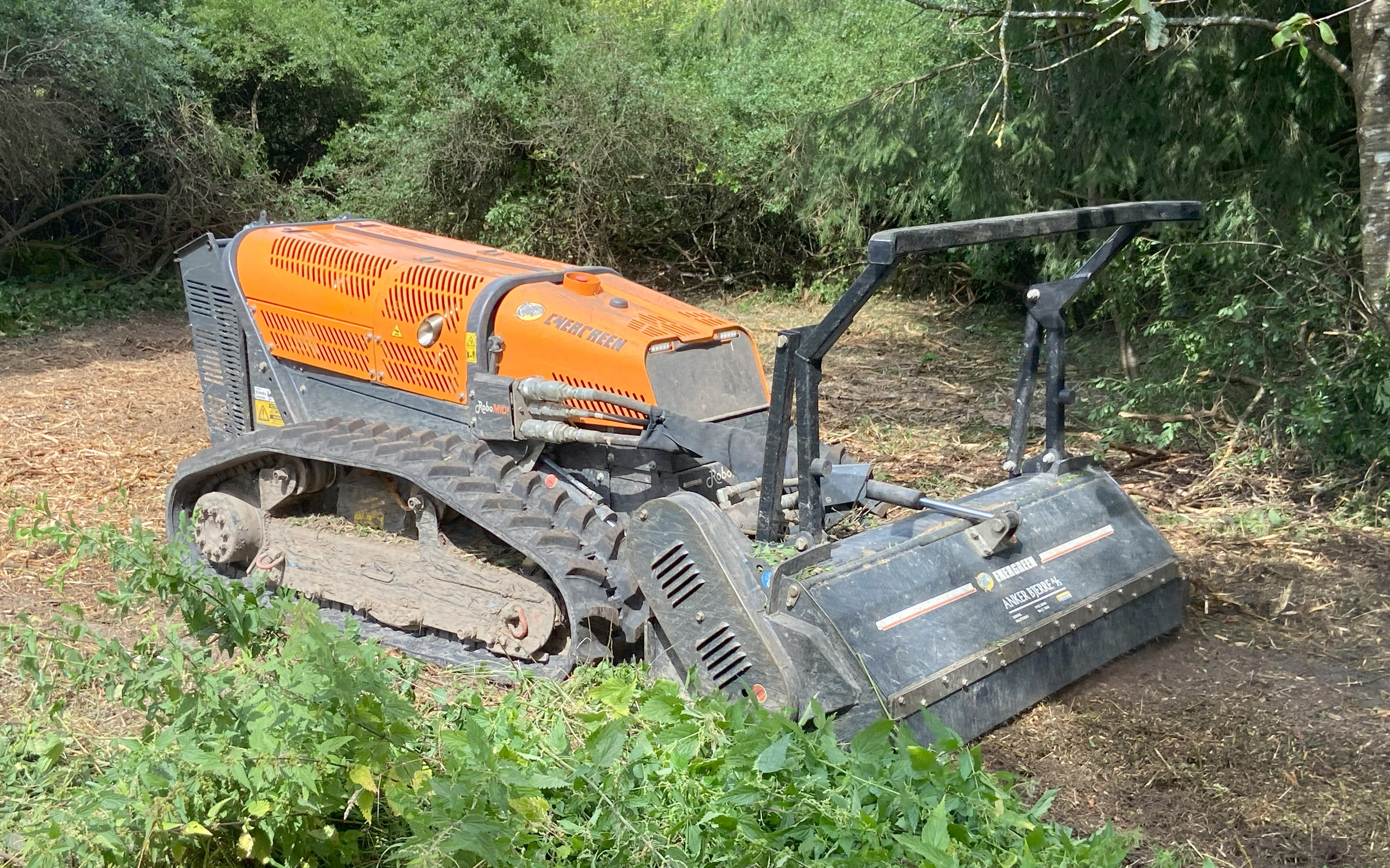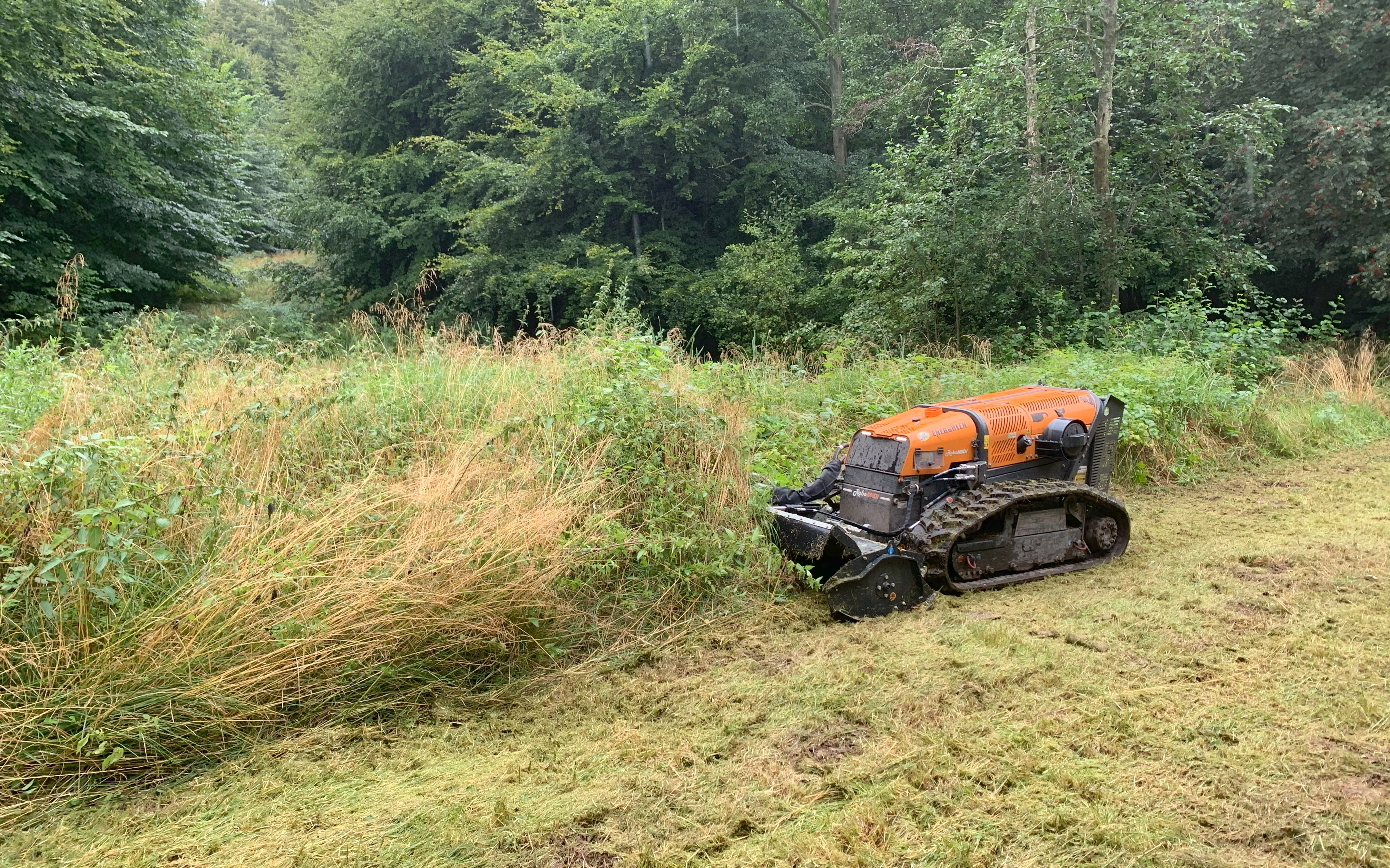 Med vores fjernstyrede Energreen RoboMIDI redskabsbærer på bælter tilbyder vi knusning / grenknusning af opvækst, træer, grendynger, bevoksninger, plantager, juletræsplantager, krat, rynket rose, brombærkrat, skrænter ved regnvandsbassiner, jernbaneskråninger, jagtspor og skov mm. Maskinen kan arbejde på skråninger op til 55° og vejer kun 2105 kg med knuserhoved monteret, hvilket gør den ideel til knusning af områder hvor et lavt marktryk er nødvendigt eller på stejle skrænter. Knuseren har en arbejdsbredde på 133 cm og knuser let emner med en diameter op til Ø12 cm. Redskabsbæreren kan også udstyres med en slagleklipper med en arbejdsbredde på 154 cm som giver en totalvægt af maskinen på blot 1950 kg, hvilket gør den særdeles velegnet til klipning og slåning af højt græs, brændenælder, buske, hybenroser / vilde roser, bjørneklo, brombærkrat og rørskov i vådområder, hvor der ikke må efterlades spor i terrænet. Endvidere er slagleklipperen eminent til etablering af jagtspor mm.