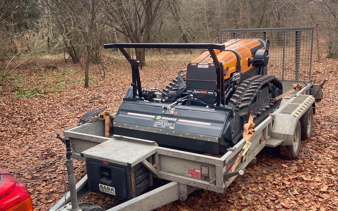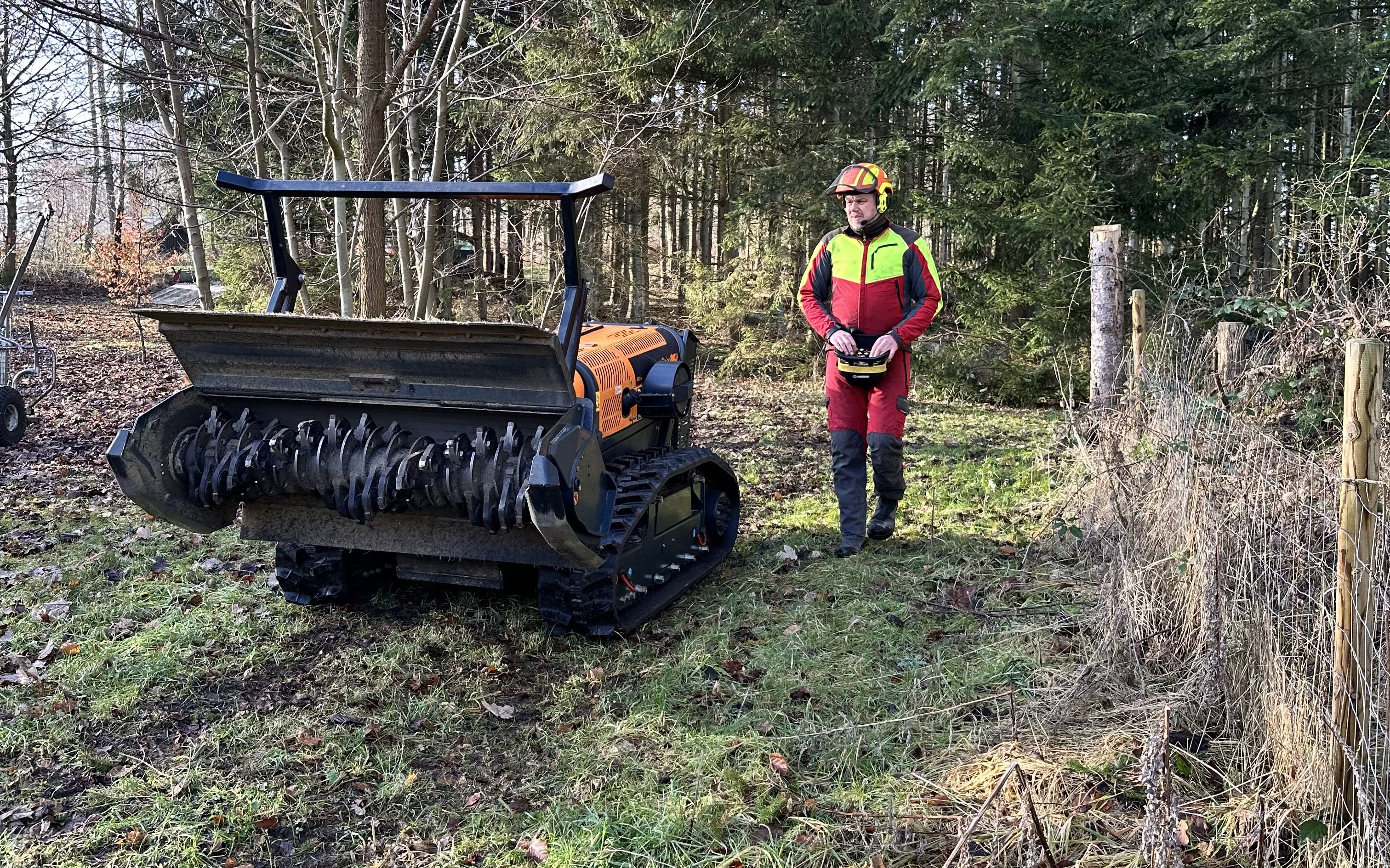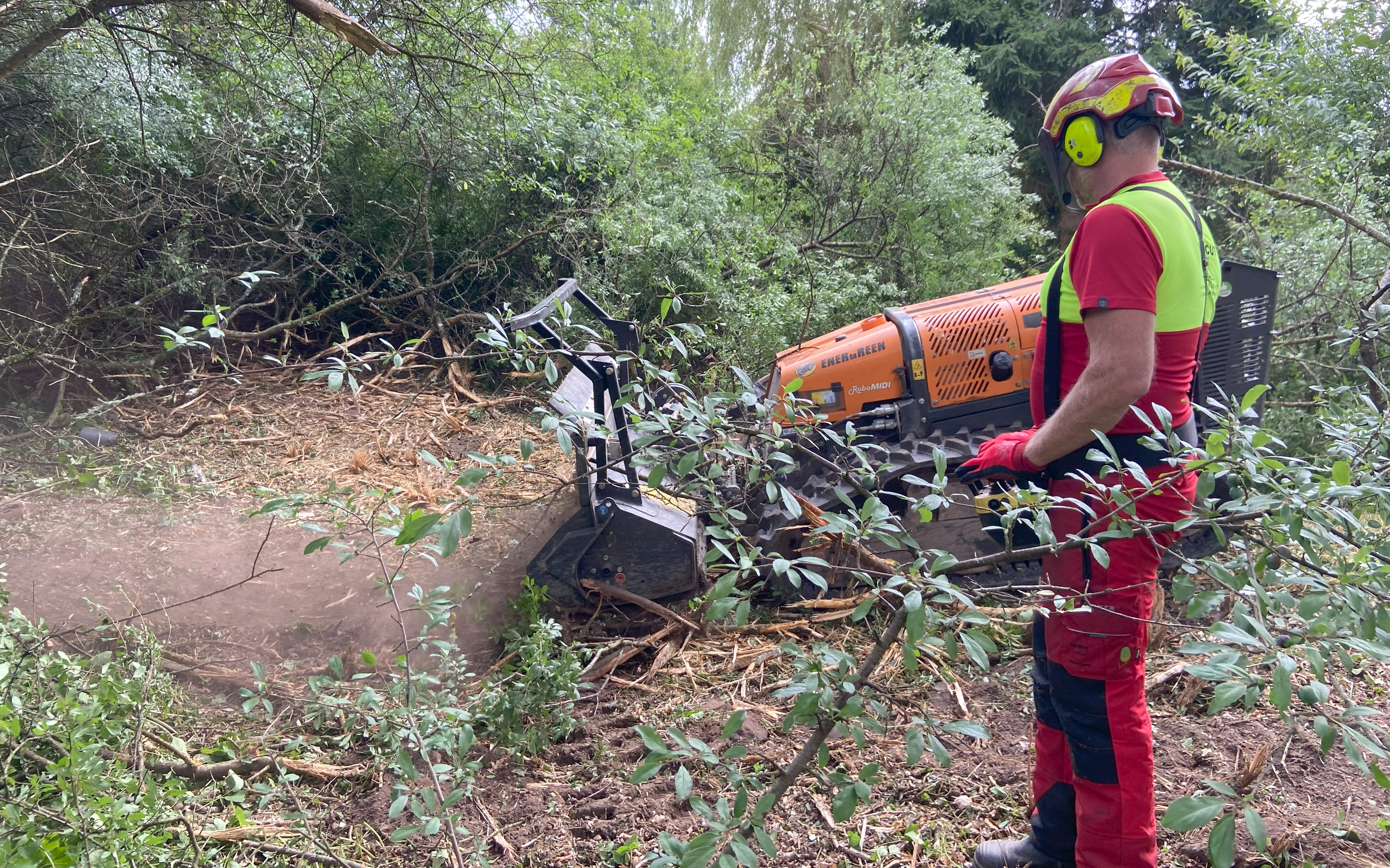 Med vores fjernstyrede Energreen RoboMIDI redskabsbærer på bælter tilbyder vi knusning / grenknusning af opvækst, træer, grendynger, bevoksninger, plantager, juletræsplantager, krat, rynket rose, brombærkrat, skrænter ved regnvandsbassiner, jernbaneskråninger, jagtspor og skov mm. Maskinen kan arbejde på skråninger op til 55° og vejer kun 2105 kg med knuserhoved monteret, hvilket gør den ideel til knusning af områder hvor et lavt marktryk er nødvendigt eller på stejle skrænter. Knuseren har en arbejdsbredde på 133 cm og knuser let emner med en diameter op til Ø12 cm. Redskabsbæreren kan også udstyres med en slagleklipper med en arbejdsbredde på 154 cm som giver en totalvægt af maskinen på blot 1950 kg, hvilket gør den særdeles velegnet til klipning og slåning af højt græs, brændenælder, buske, hybenroser / vilde roser, bjørneklo, brombærkrat og rørskov i vådområder, hvor der ikke må efterlades spor i terrænet. Endvidere er slagleklipperen eminent til etablering af jagtspor mm.
