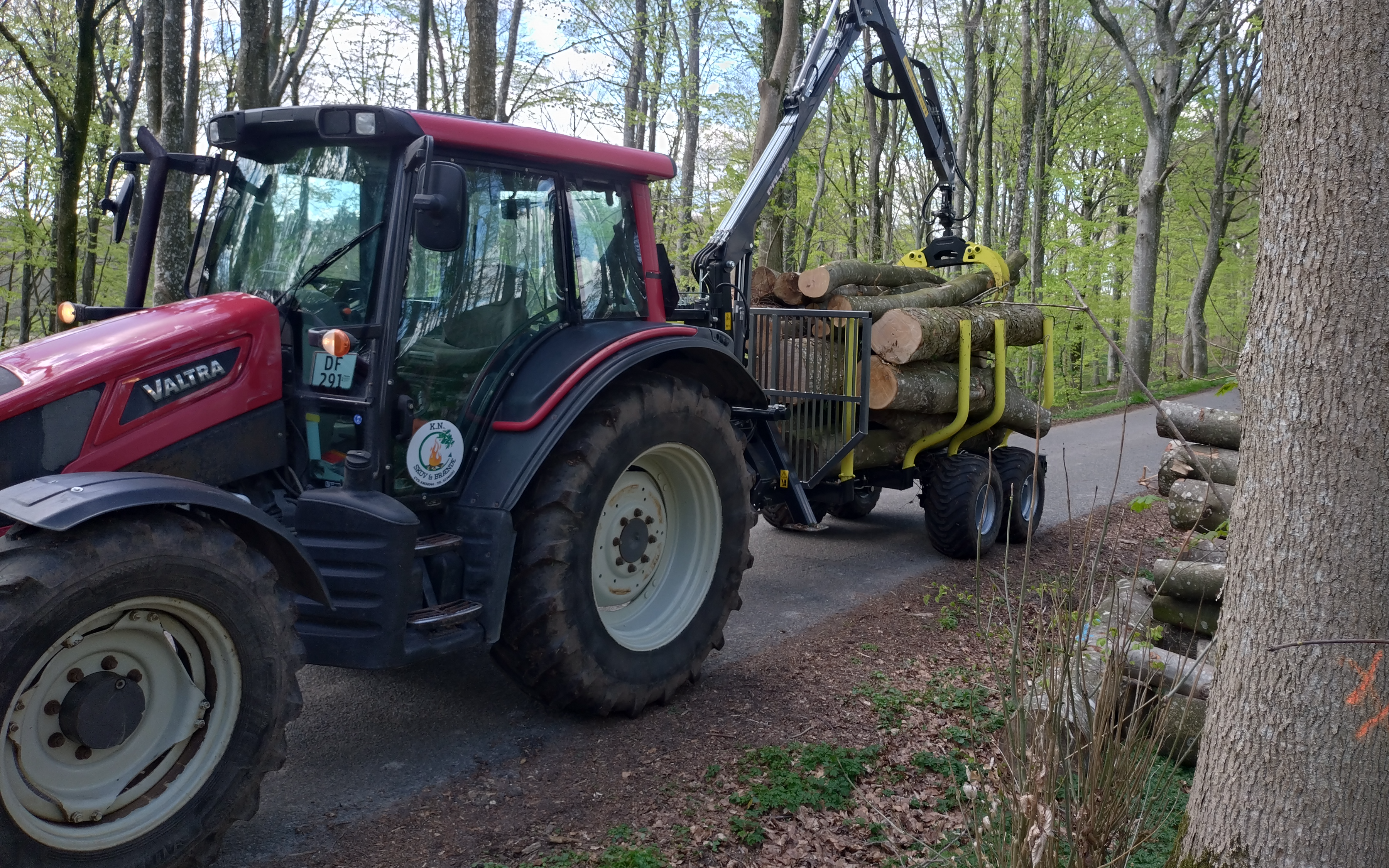 Udkørsel af træ med traktor og skovvogn fint lille sæt der ikke efterlader mange spor