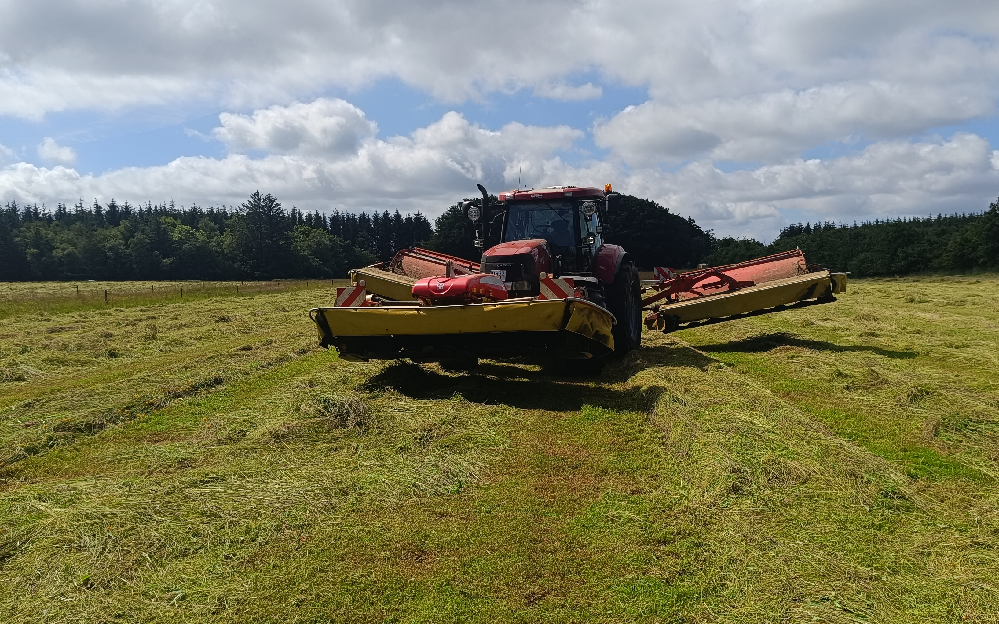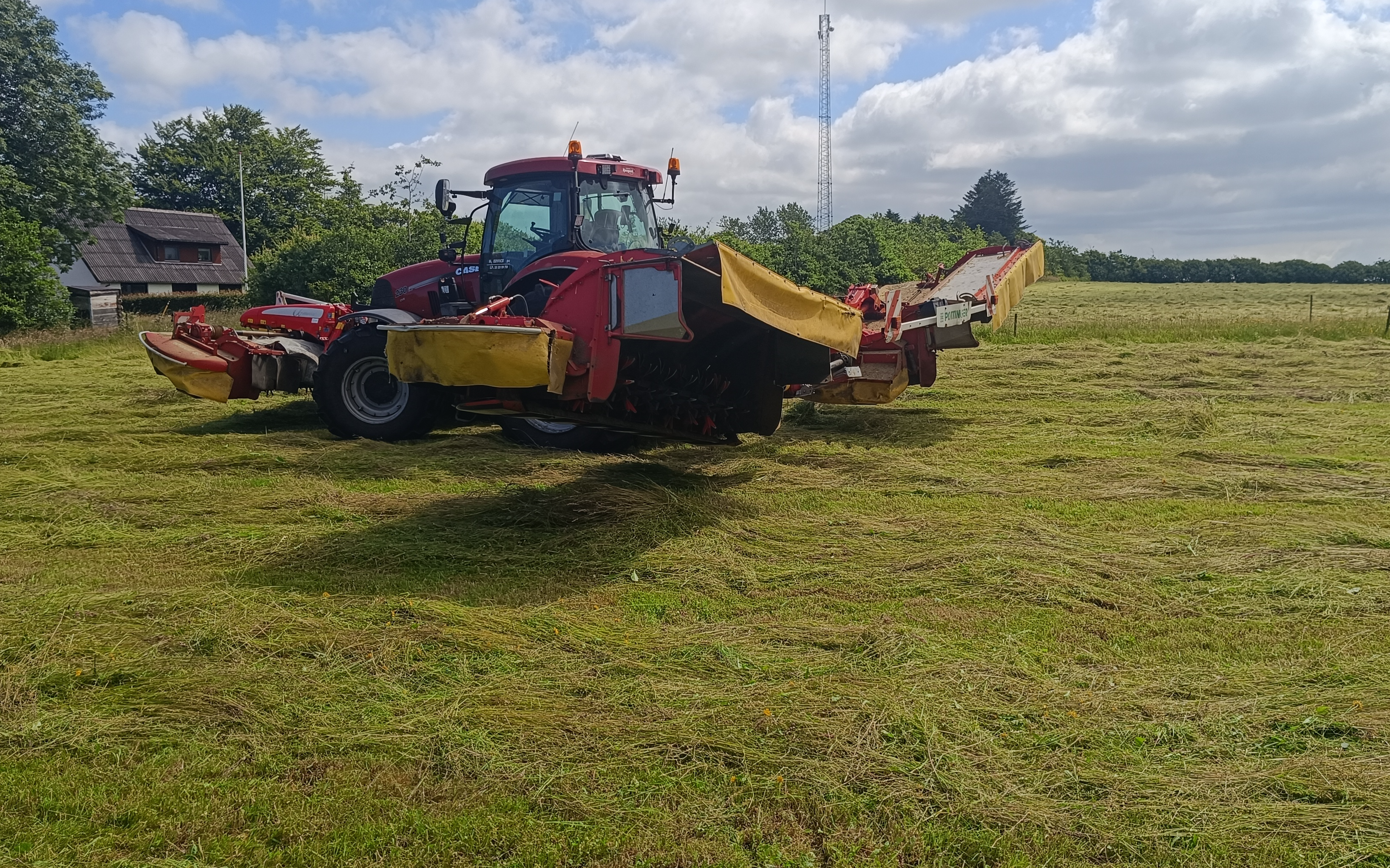 10 meters Skårlægning af græs med crimper uden bånd på Dette er en pøttinger med hydraulik mark tryk på så den er mere skånsom over for græsset den køre ikke bar på jorden den svæver hend over markerne
