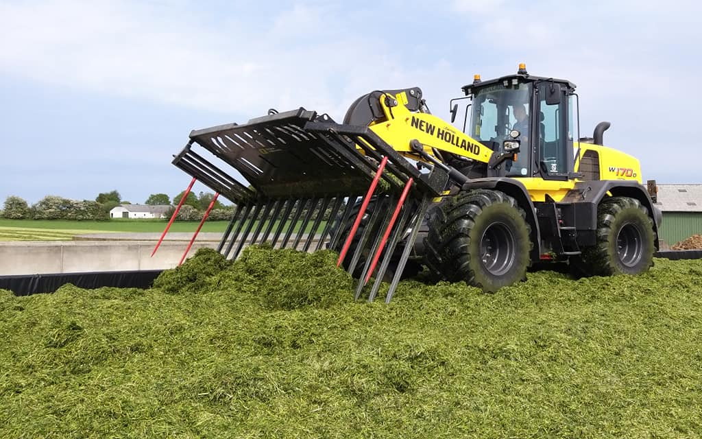 17T Gummiged med ensilagegreb eller skovl til stakkørsel. 17T Gummiged med skovl til læsning af husdyrgødning og jordarbejde. Gummigeden er udstyret med hurtigskift, så der nemt kan skiftes mellem skovl og ensilagegreb. Af ekstraudstyr har maskinen joystickstyring, stor ledlys pakke samt ekstra brændstofstank.