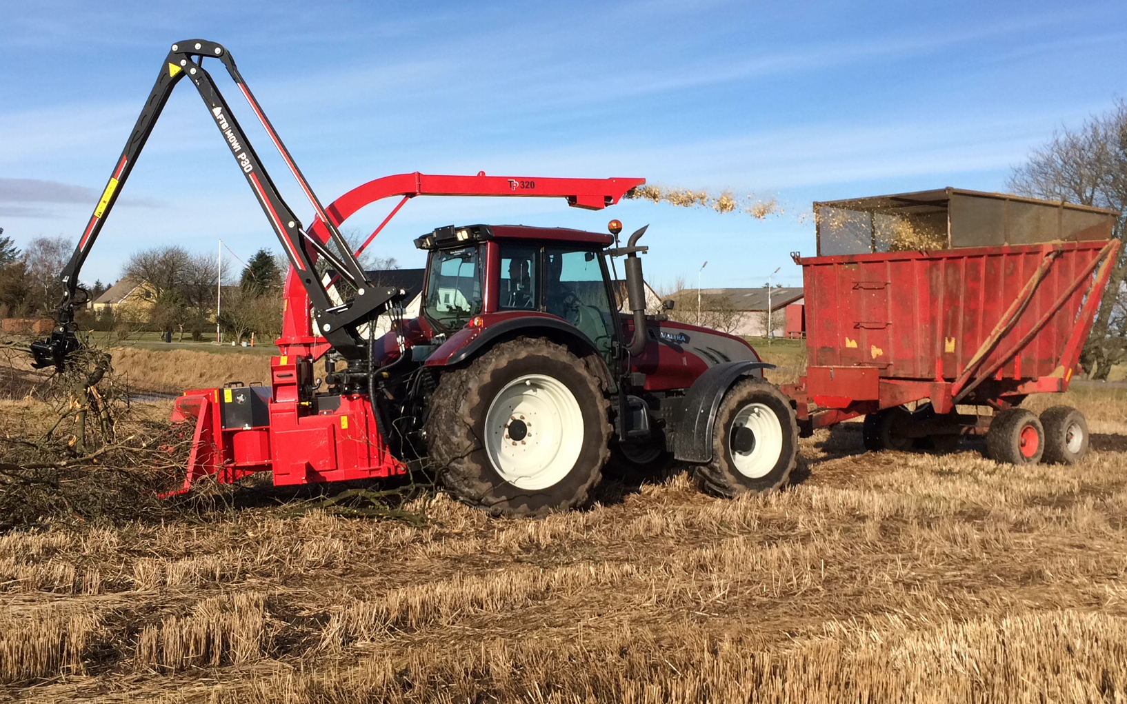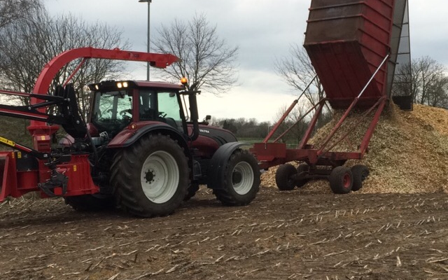 Vi køre med en valtra t202 traktor med vendeudstyr. En TP 320 flishugger der kan tage op til 32 cm og en højtidvogen der kan være 16 m3 i