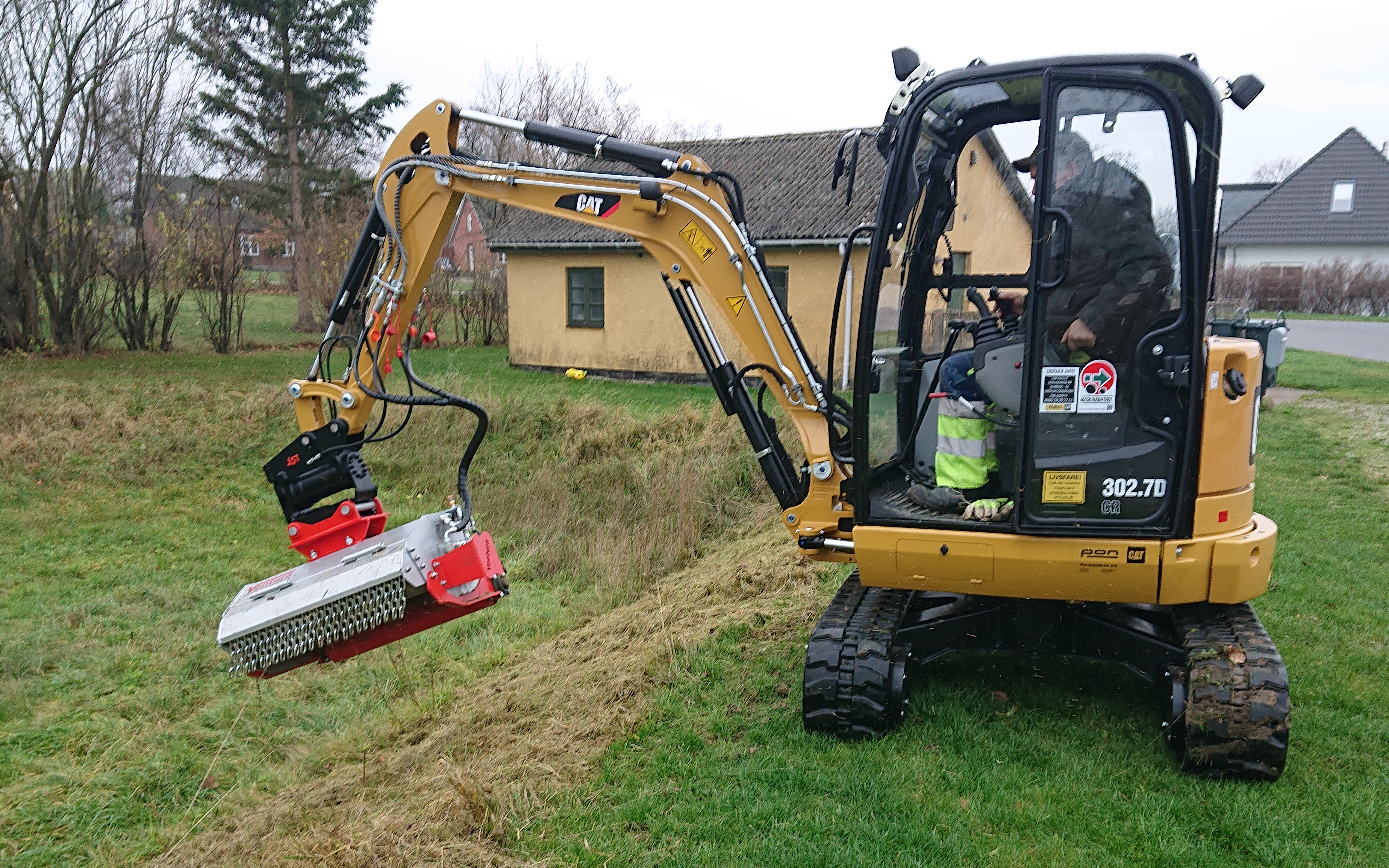 Slagleklipning og knusning af mindre buskads på skråninger og vådområder med kompakt minigraver og slagleklipper maskine kan køre de fleste steder med mindre chance for trykskader i forhold til de større maskiner.