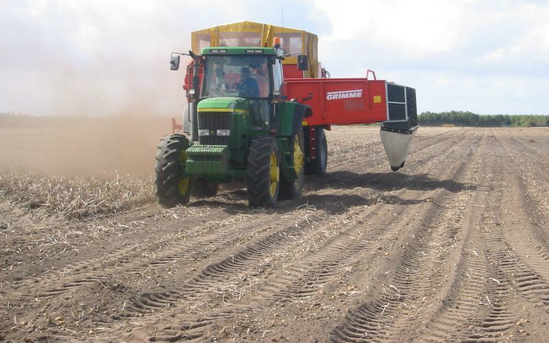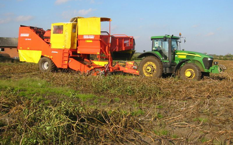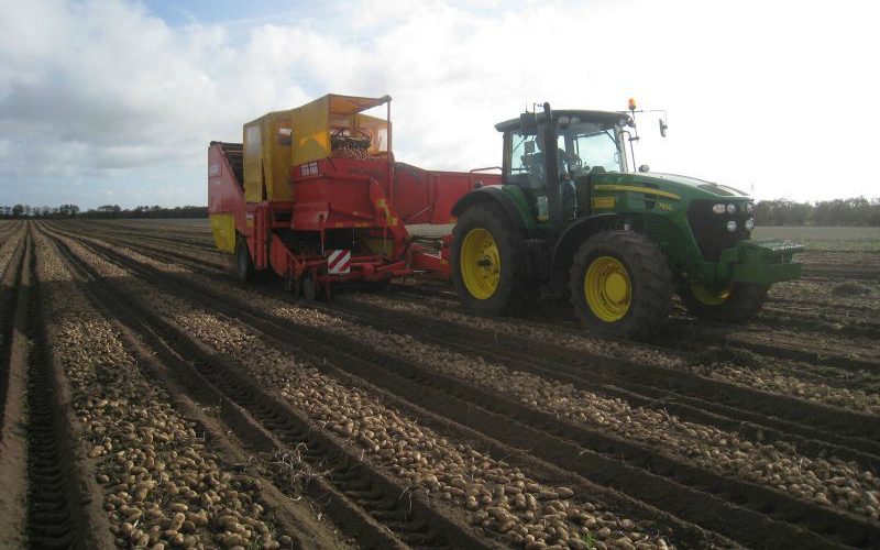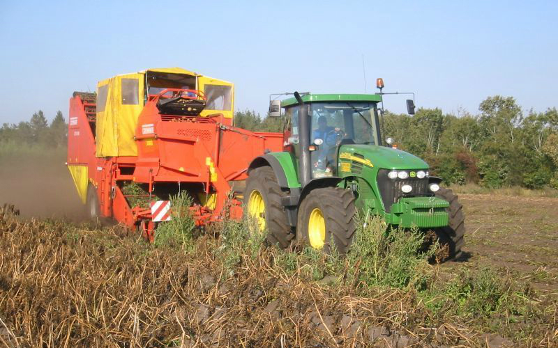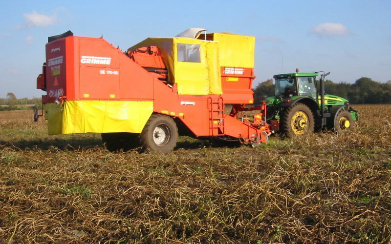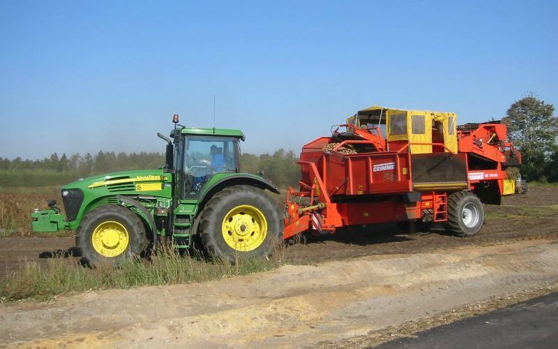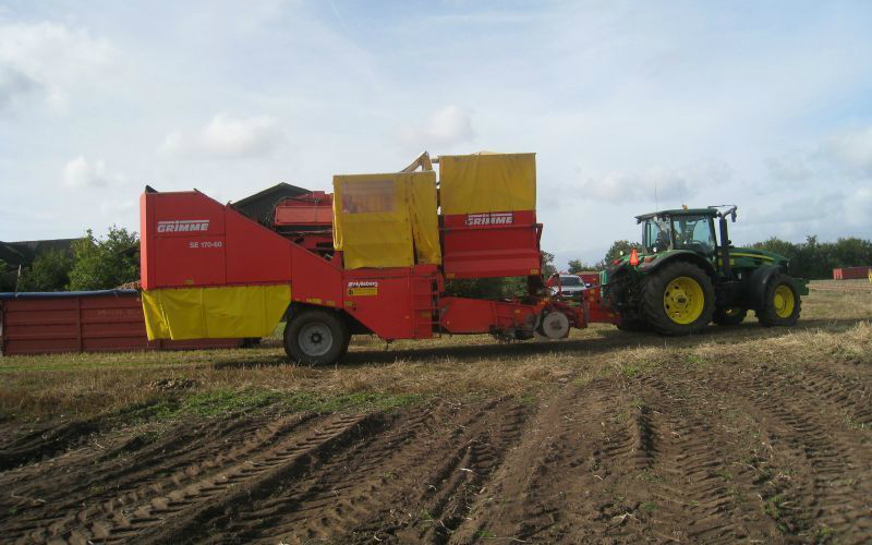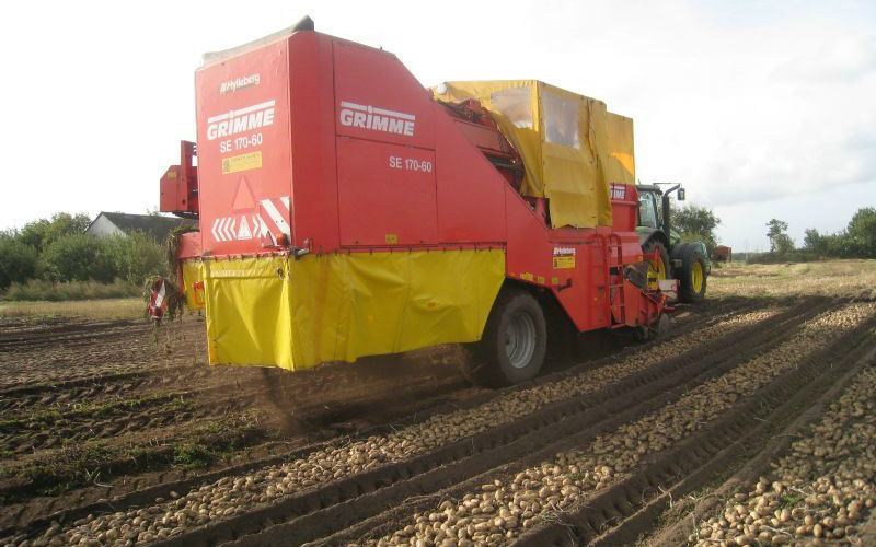 Grimme to rækkers kartoffeloptager med 6 ton rulletank. Der kan påmonteres udstyr til skånsom optagning af frilagte kartofler. To jordkæder arbejder tæt sammen, garanterer en yderst effektiv separering og skånsom behandling af kartoflerne. Frilægning af kartofler tilbydes naturligvis også.