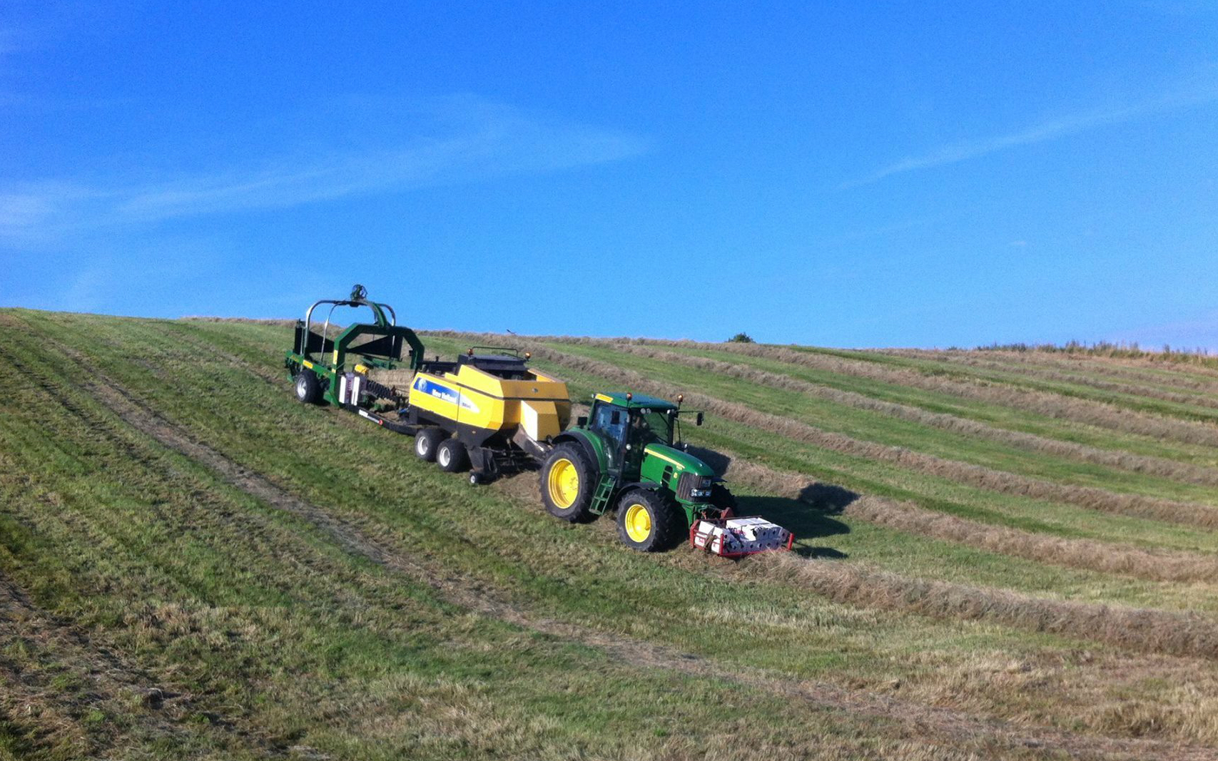 Vi kommer ud med vores "fut-tog". En sammenbygning af midiballepresser og wrapper. Det gør at presningen og wrapningen sker helt uden ballen rør jorden.
