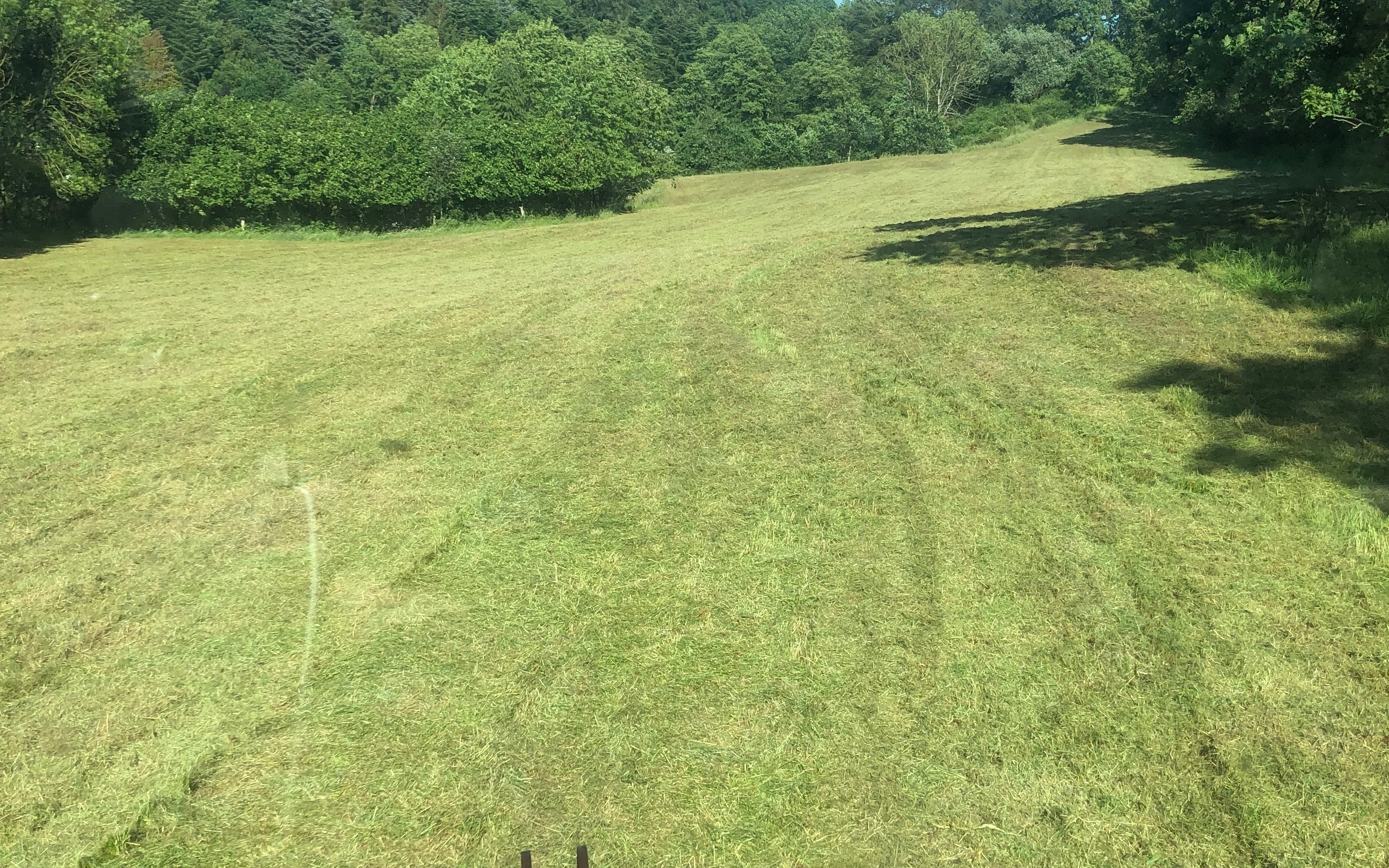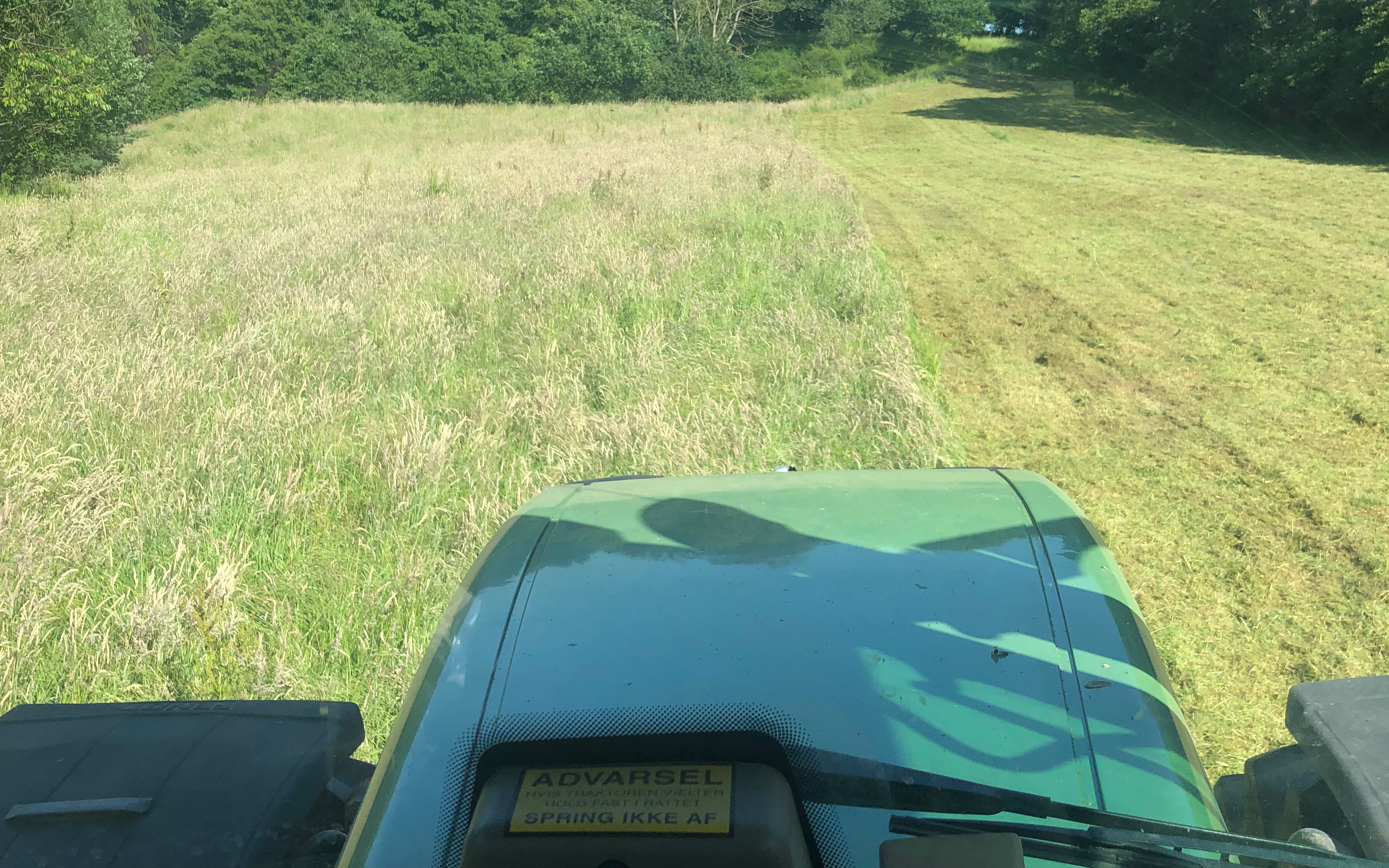 Afpudsning af brak og enge med 3 meters brakpudser monteret med hammerslagler så den knuser os små buskads.