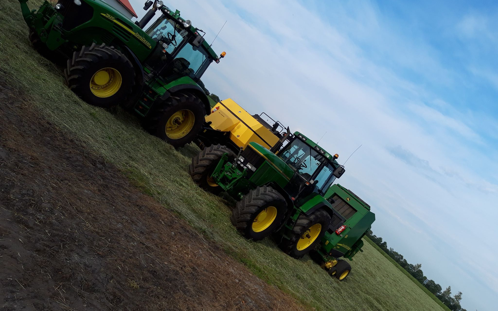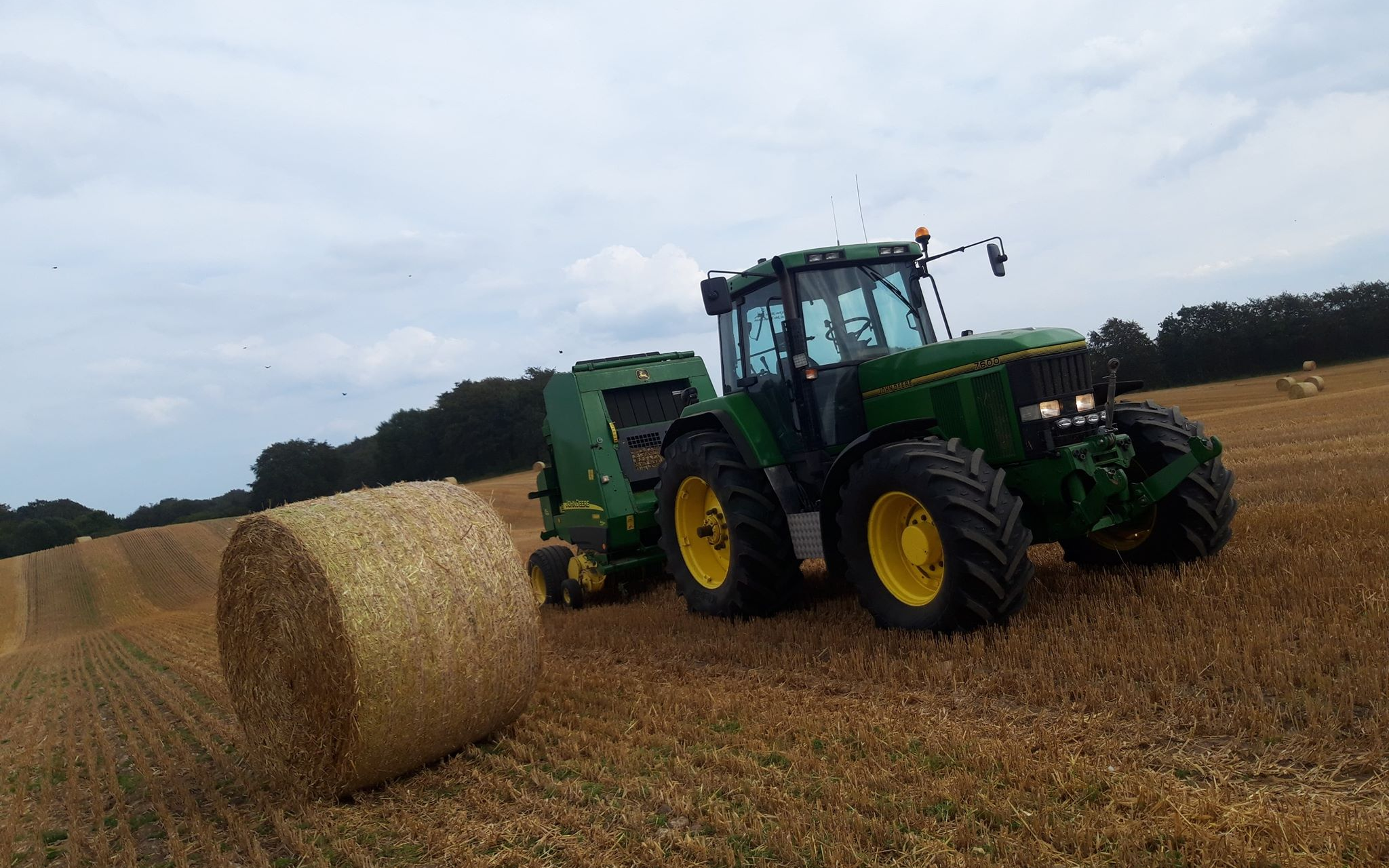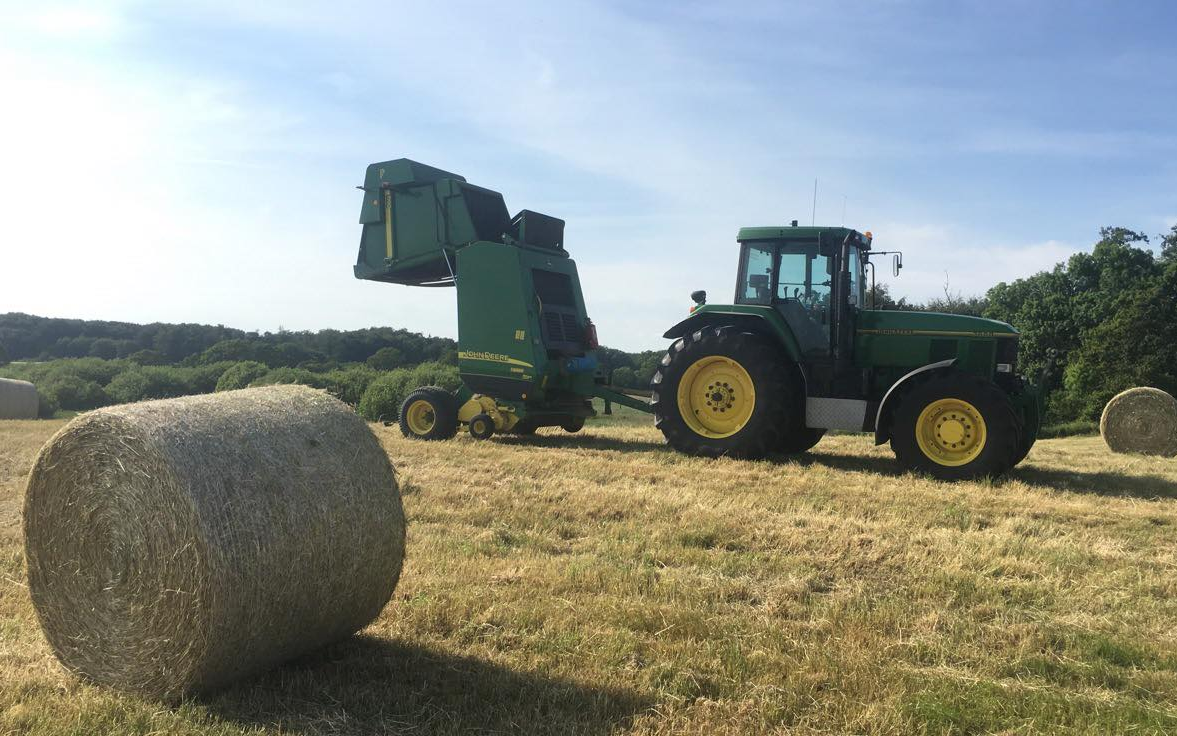 Rundballepresning udføres med John Deere 592 Der presses baller op til 1,80m. med netbinding