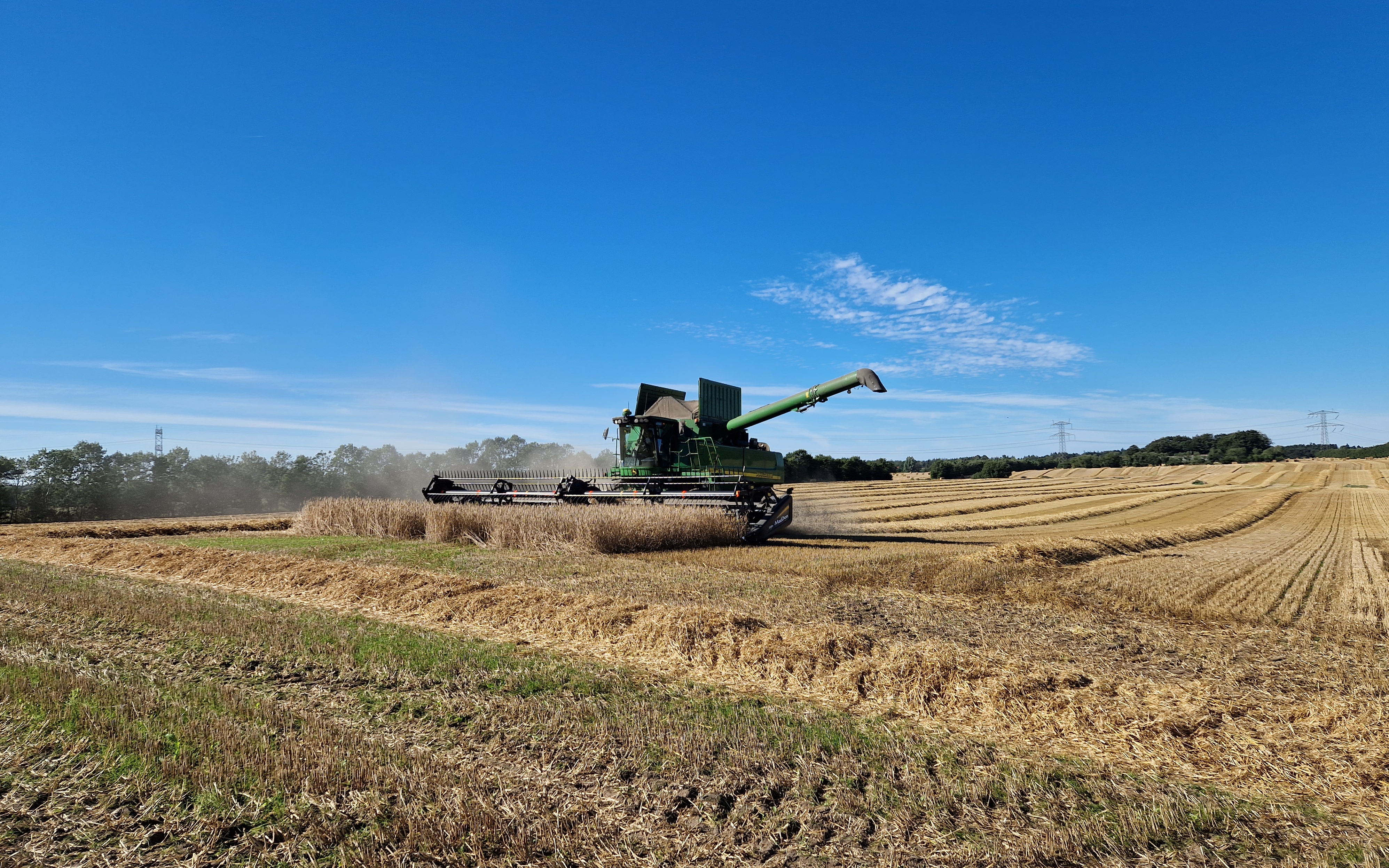 40 fods Macdon skærebord med sidekniv og autostyring. Udbyttekort kan sendes gennem JD link Kapacitet op til 40 tons i timen.
