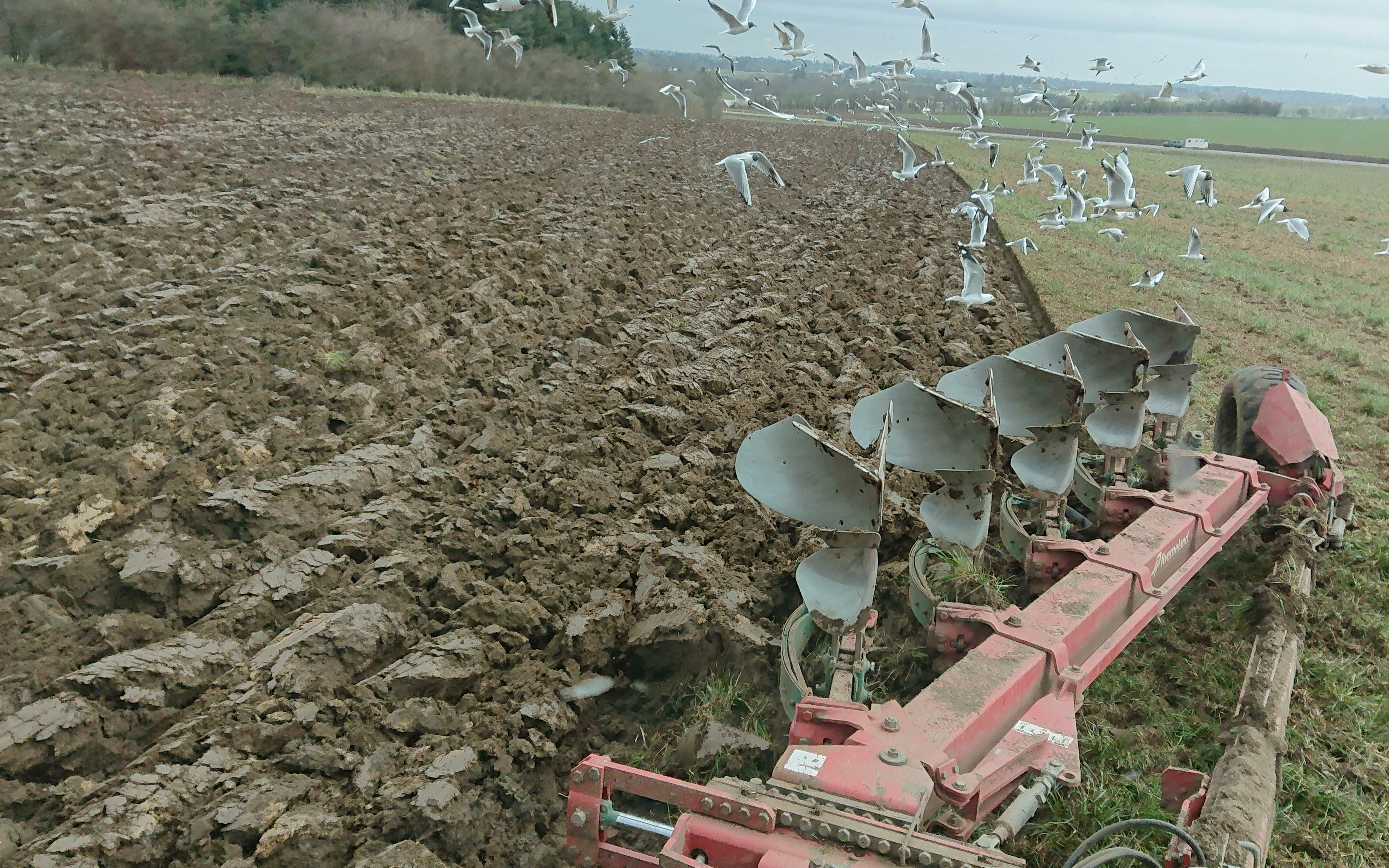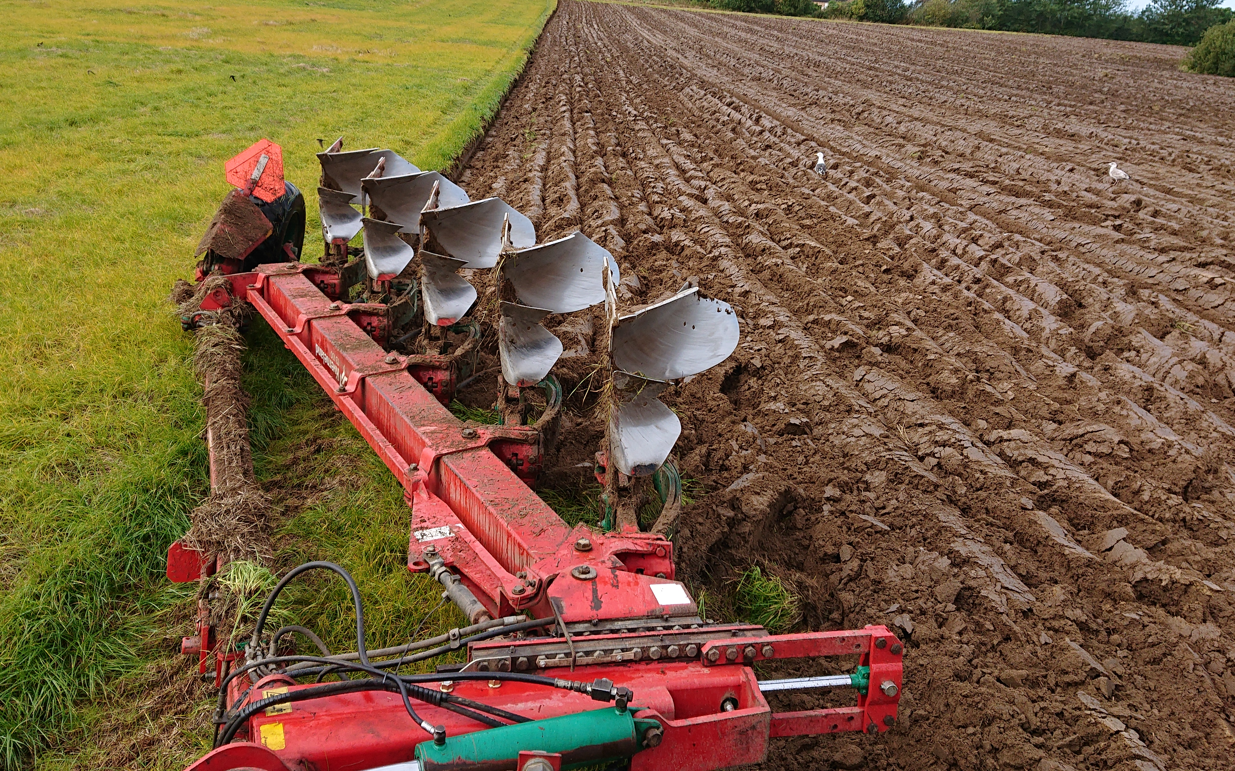 Pløjning med 5 furet halvbugseret hydraulisk variabel plov, "plovmandens plov" som de siger på plovfabrikken kverneland. Hydraulisk variabel furebredde på alle fure samt ekstra hydraulisk regulering på første fure. Underplov krop 28 der vender og pakker jorden godt, den bedste på markedet, siges der.