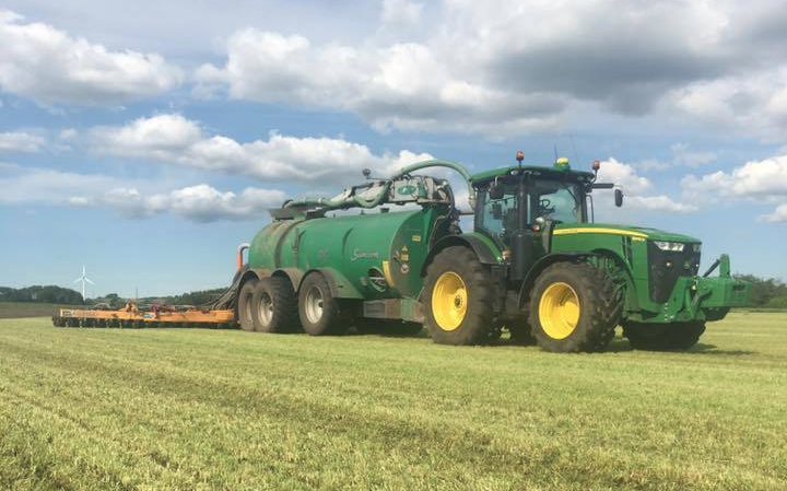 Vi tilbyder nedfældning af gylle på græs, med to stk Samson 12 meter nedfælder. Græsnedfælderen er med dobbeltskær Der er os mulighed for udskydning af en aksel, hvilket giver en større trykflade, som derved nedsætter marktrykket.